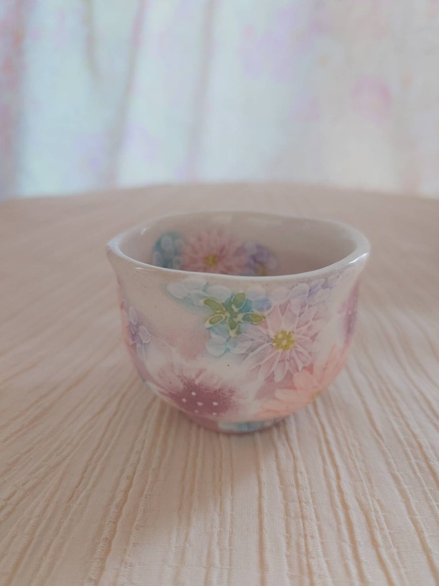 工房ゆずりは ぐい吞み サーモンピンクの優しい花柄に鮮やかな花々がとても綺麗な絵柄 ぐい吞み大 紅彩花間取