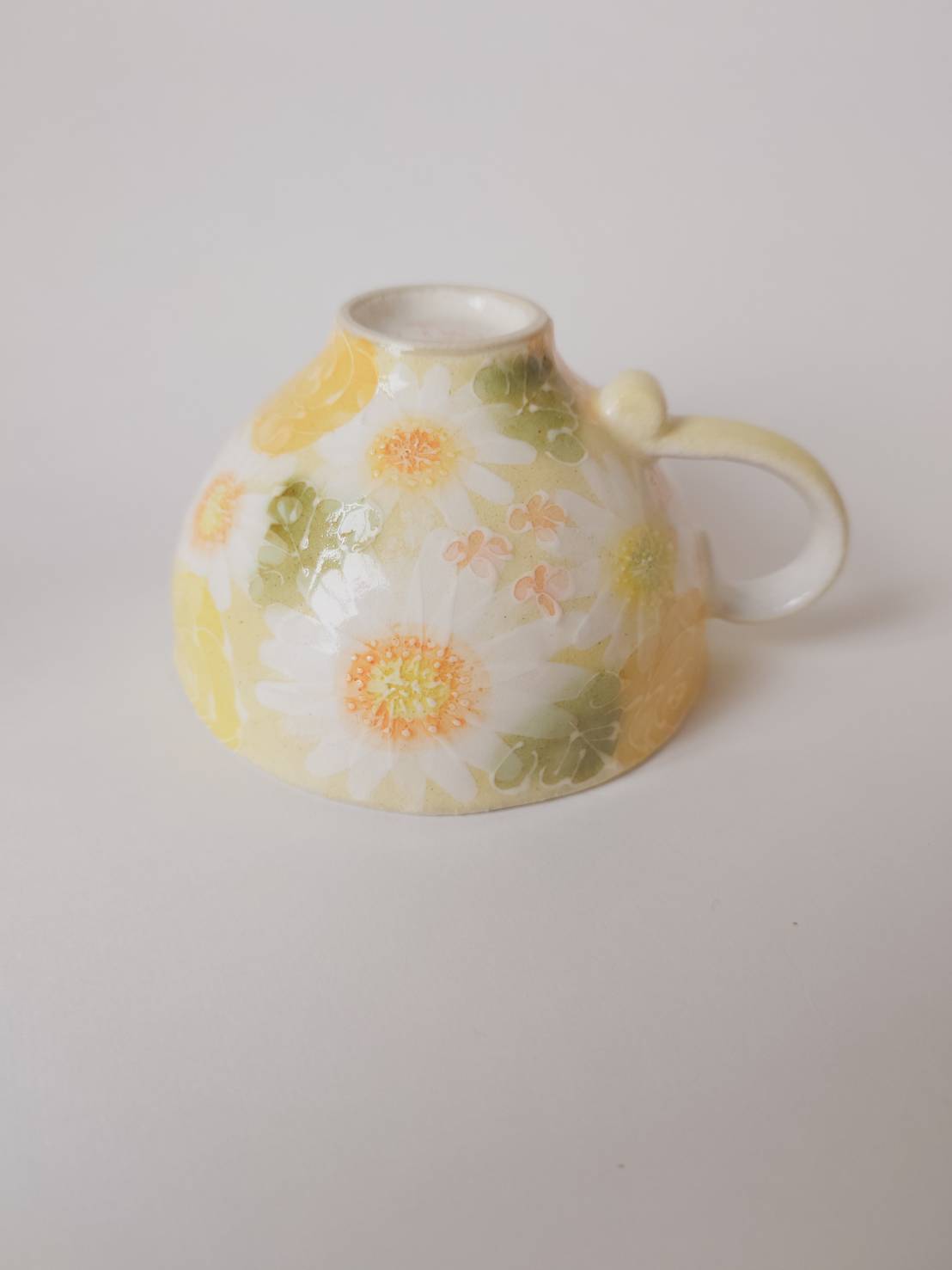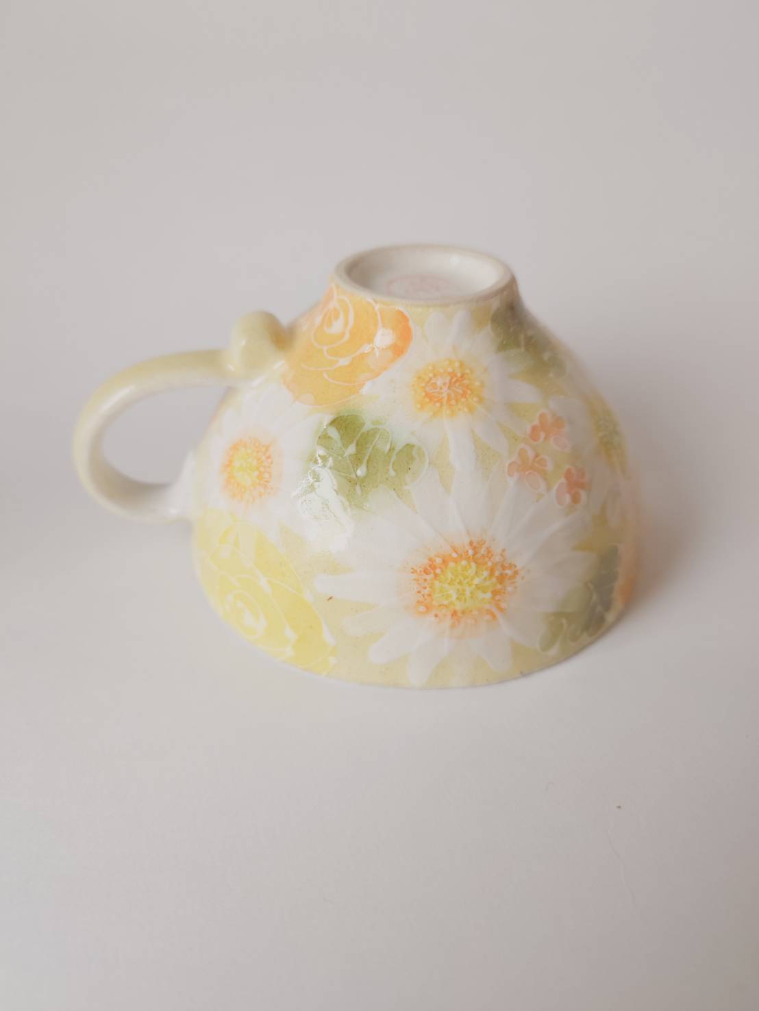 黄彩色絵花 カップ&ソーサー 黄色地にマーガレットを思わせる白い花がとても鮮やか 黄彩色絵花