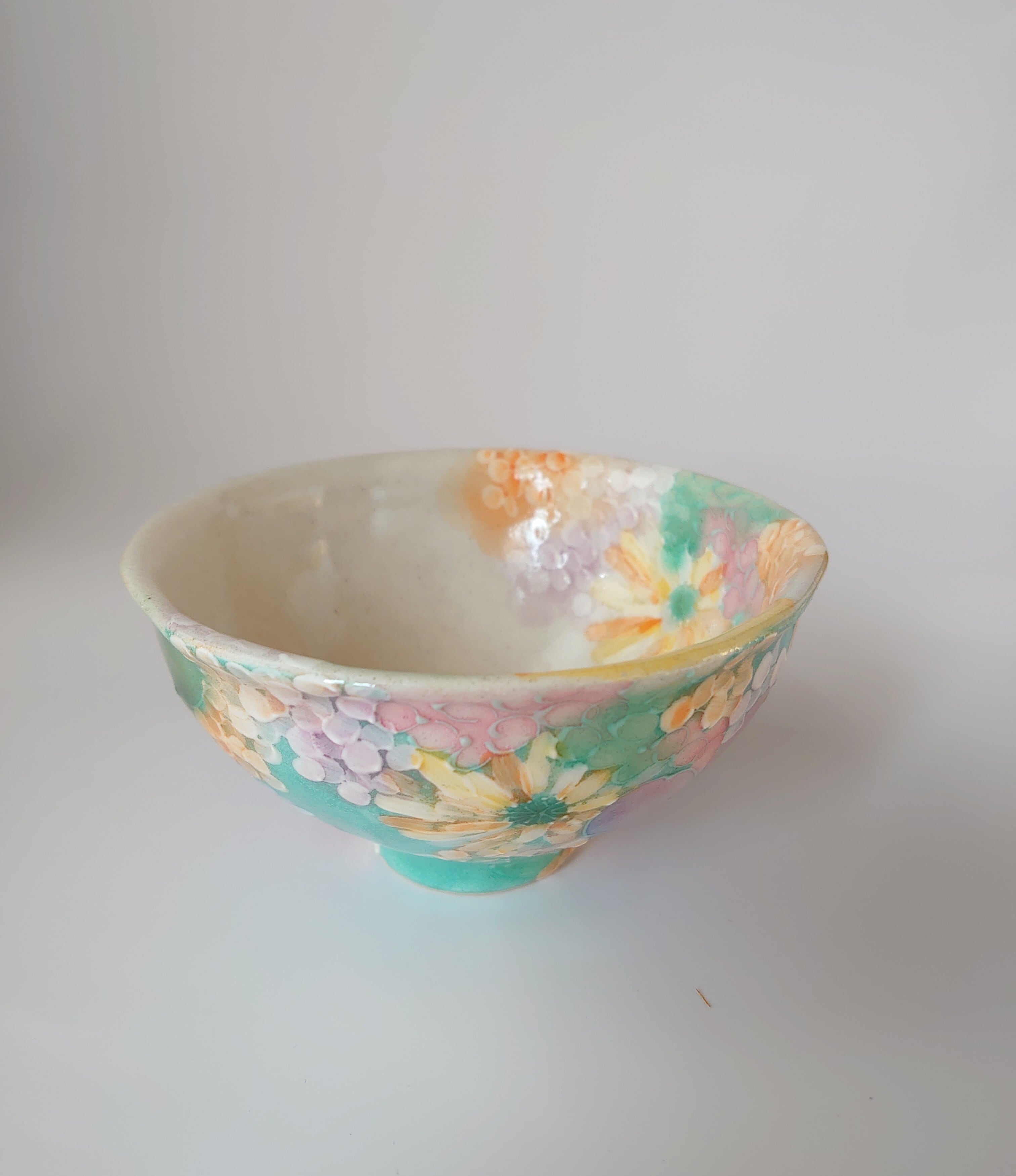 鮮やかなグリーンとイエローの絵柄が華やかな彩釉花のお茶碗