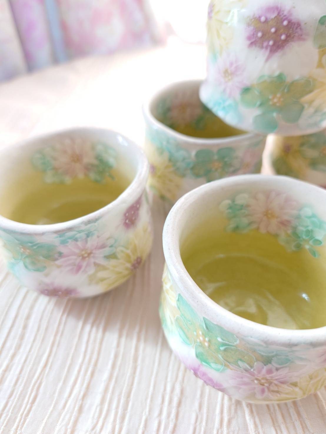 工房ゆずりは 丸ポット・ぐい吞み(平型)大5個 彩小花紋