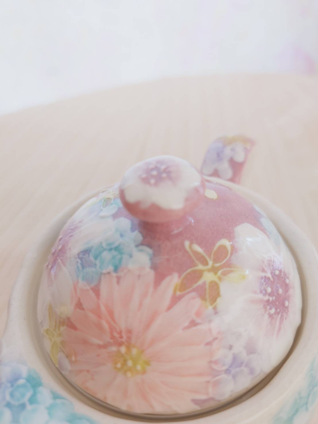 工房ゆずりは プチポット・ぐい吞み(丸型)大2個45260 薄い紫色系の花柄がとても綺麗な絵柄 色彩花 45260