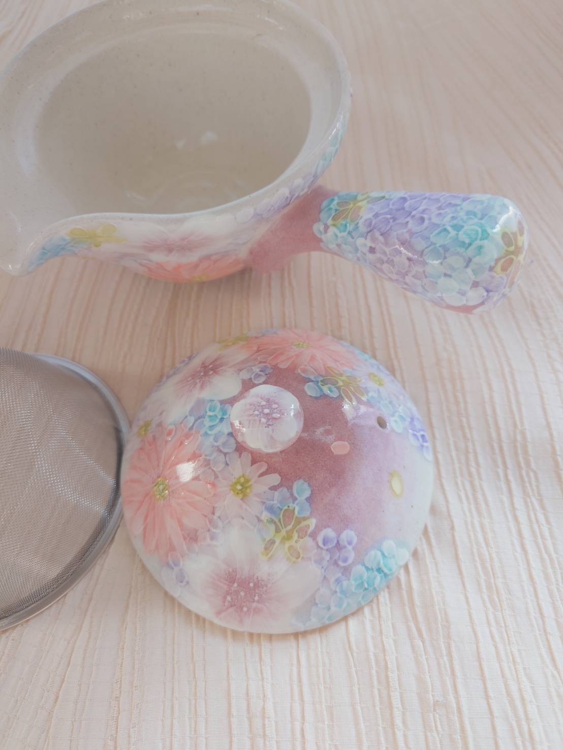工房ゆずりは 平急須 薄い紫色系の花柄がとても綺麗な絵柄 色彩花