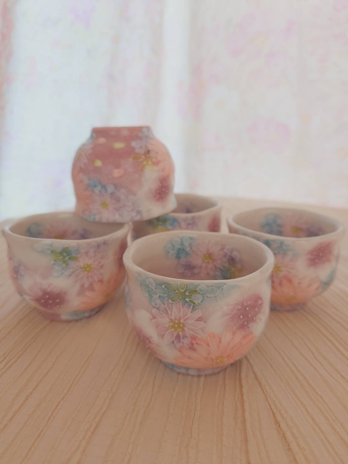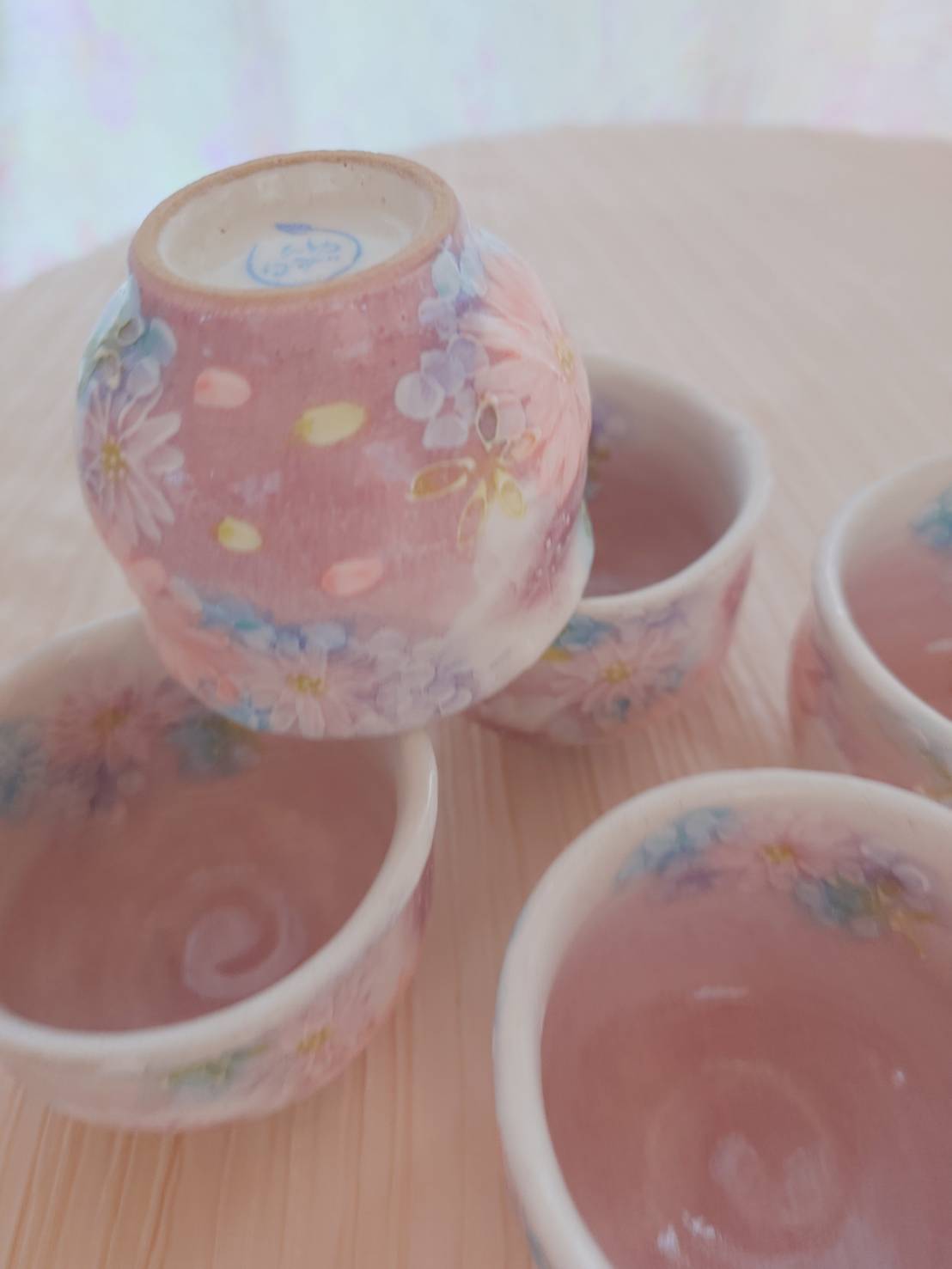 工房ゆずりは ぐい吞み(丸型)大5個 薄い紫色系の花柄がとても綺麗な絵柄 色彩花