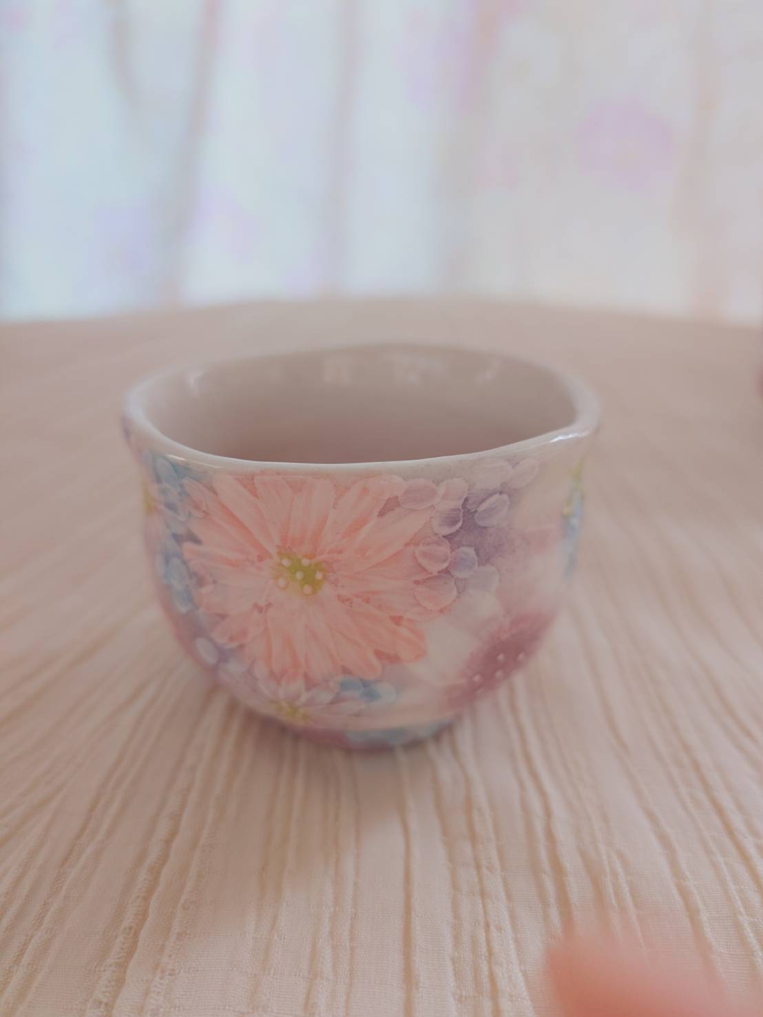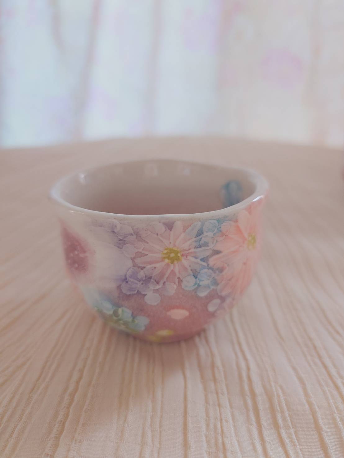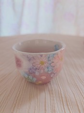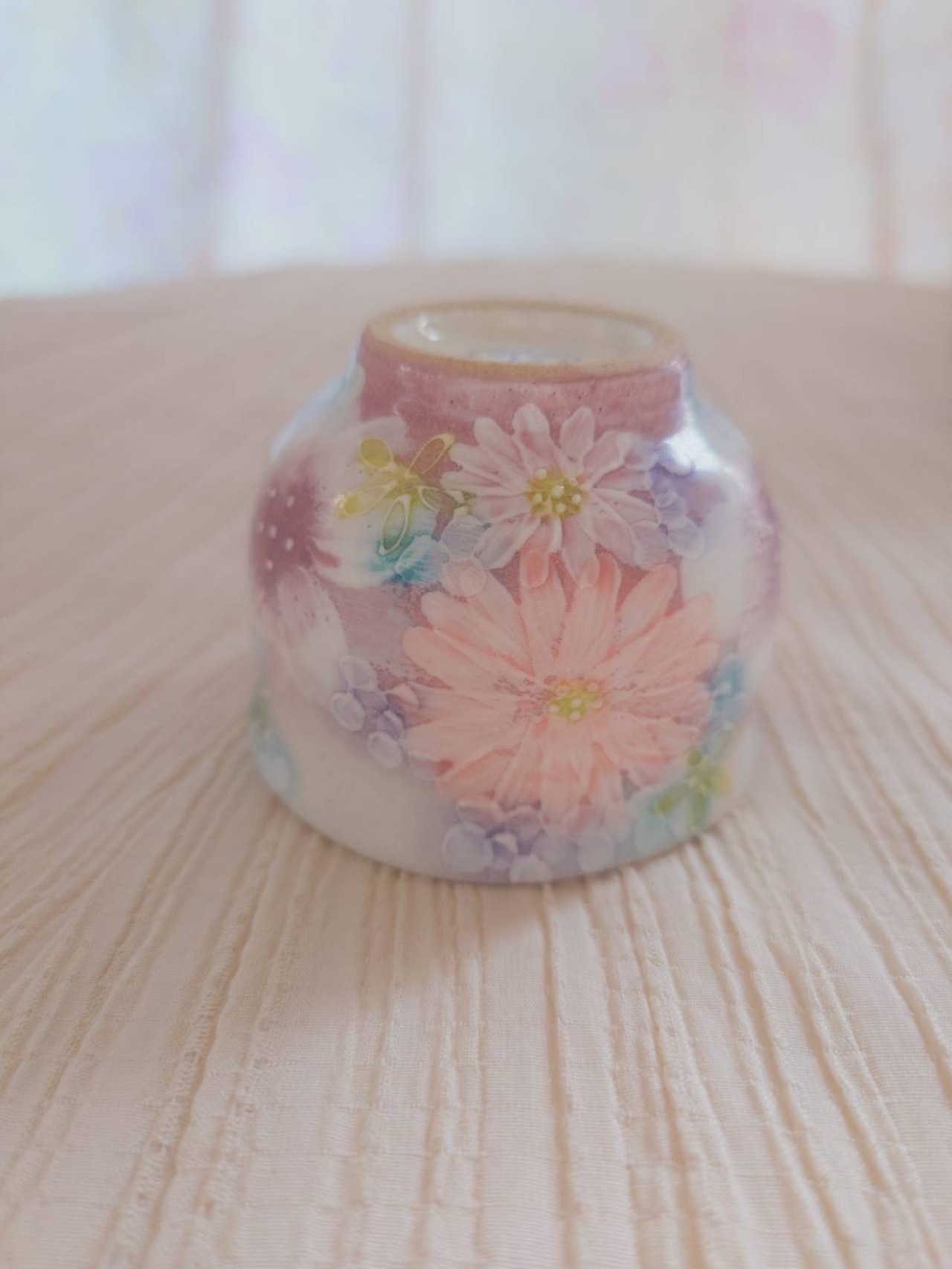 薄い紫色系の繊細な小花柄がとても綺麗な色彩花のぐい吞み大