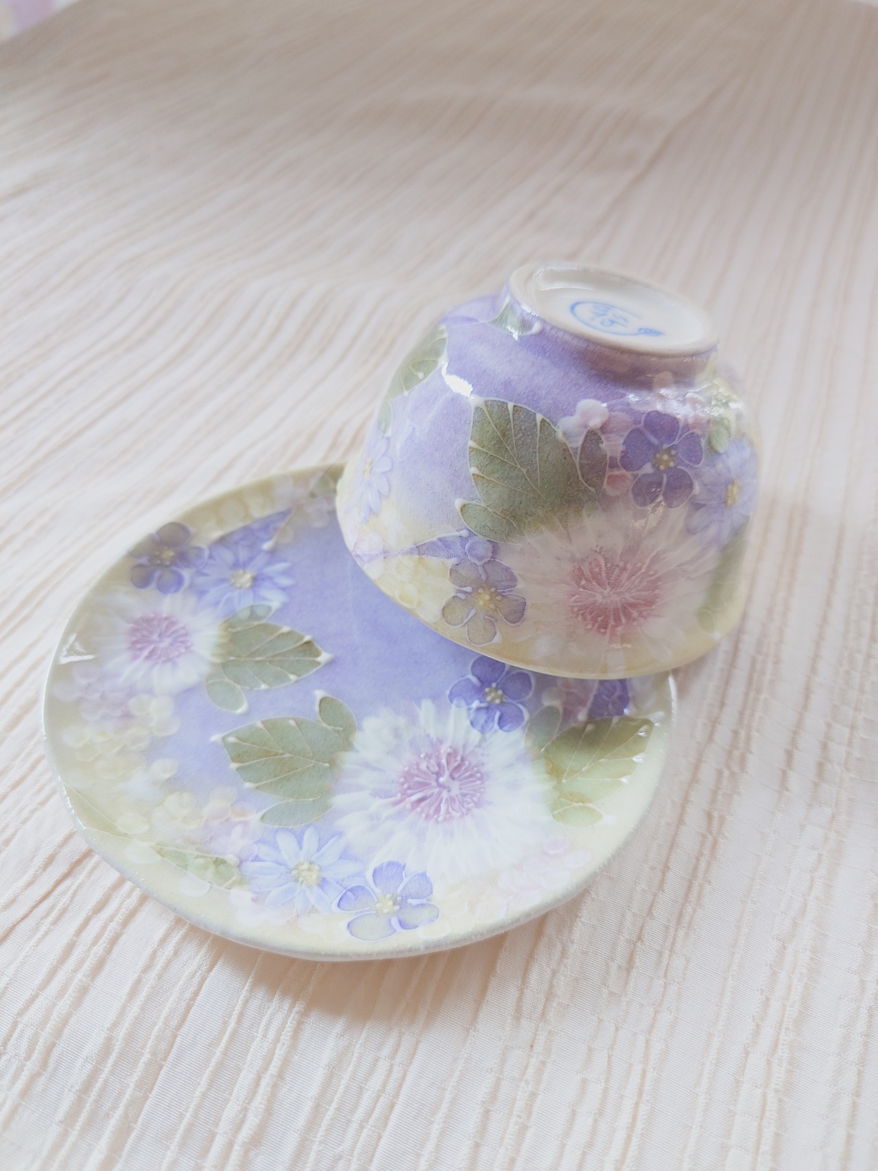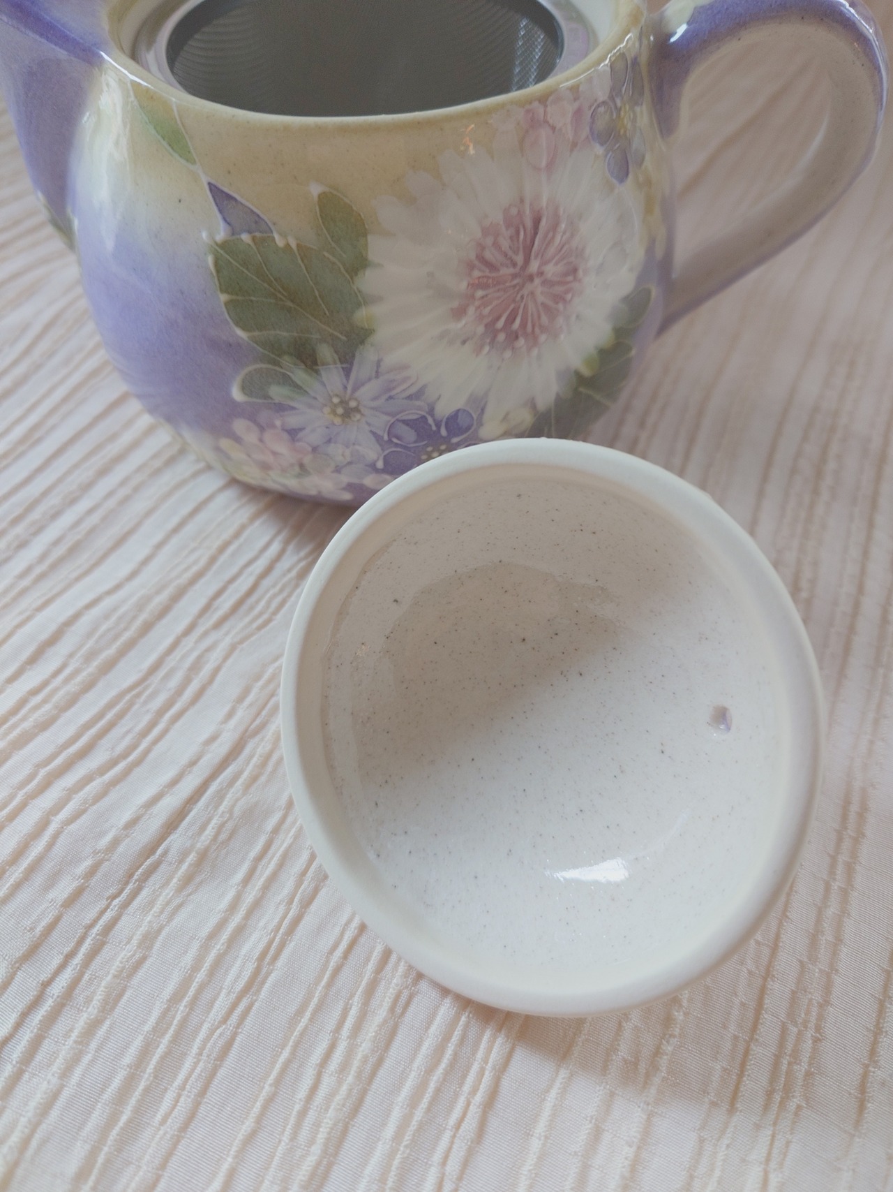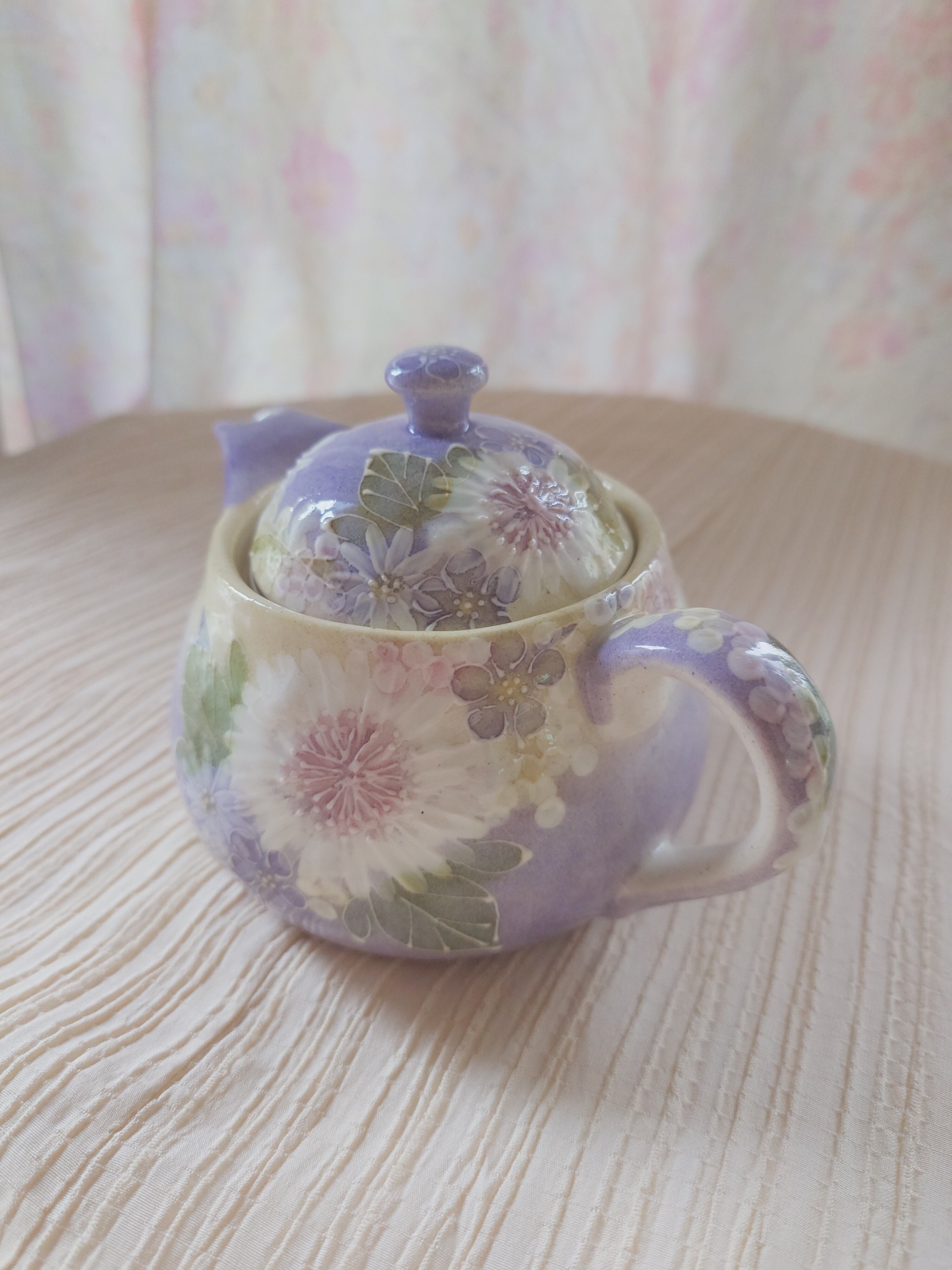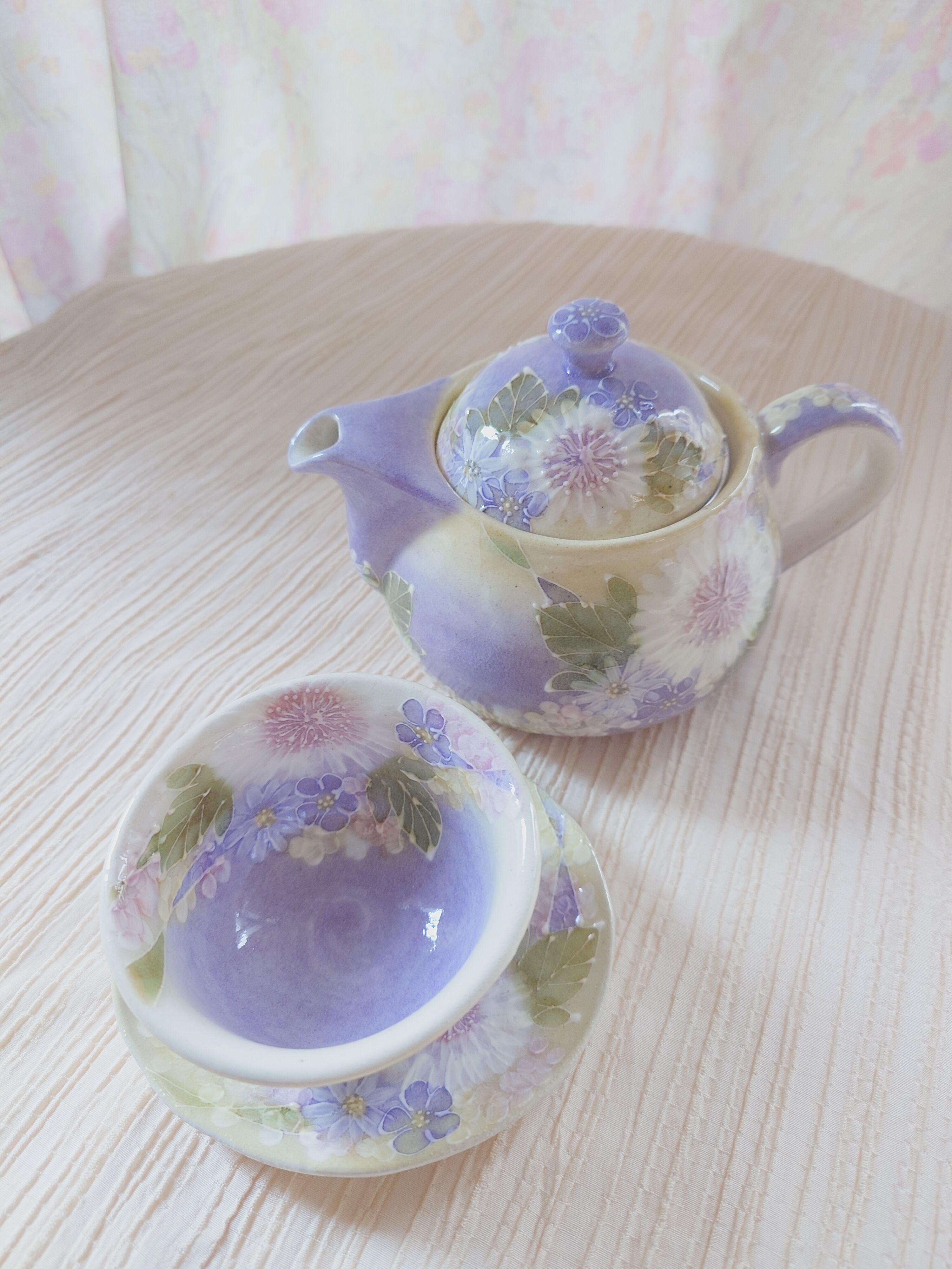 工房ゆずりは 丸ポットと茶菓セット 紫を主体にした華やかで落ち着いた上品な絵柄
