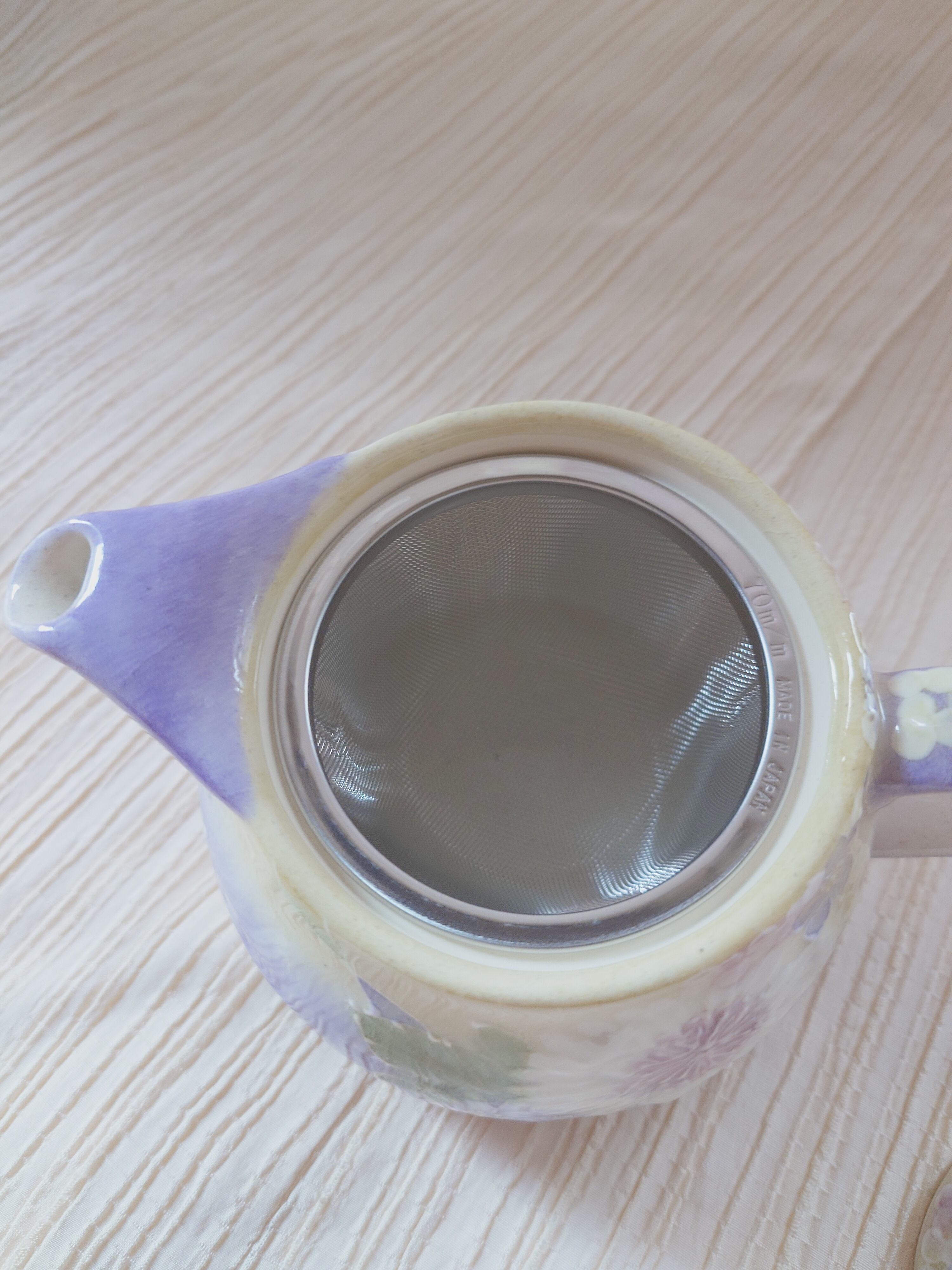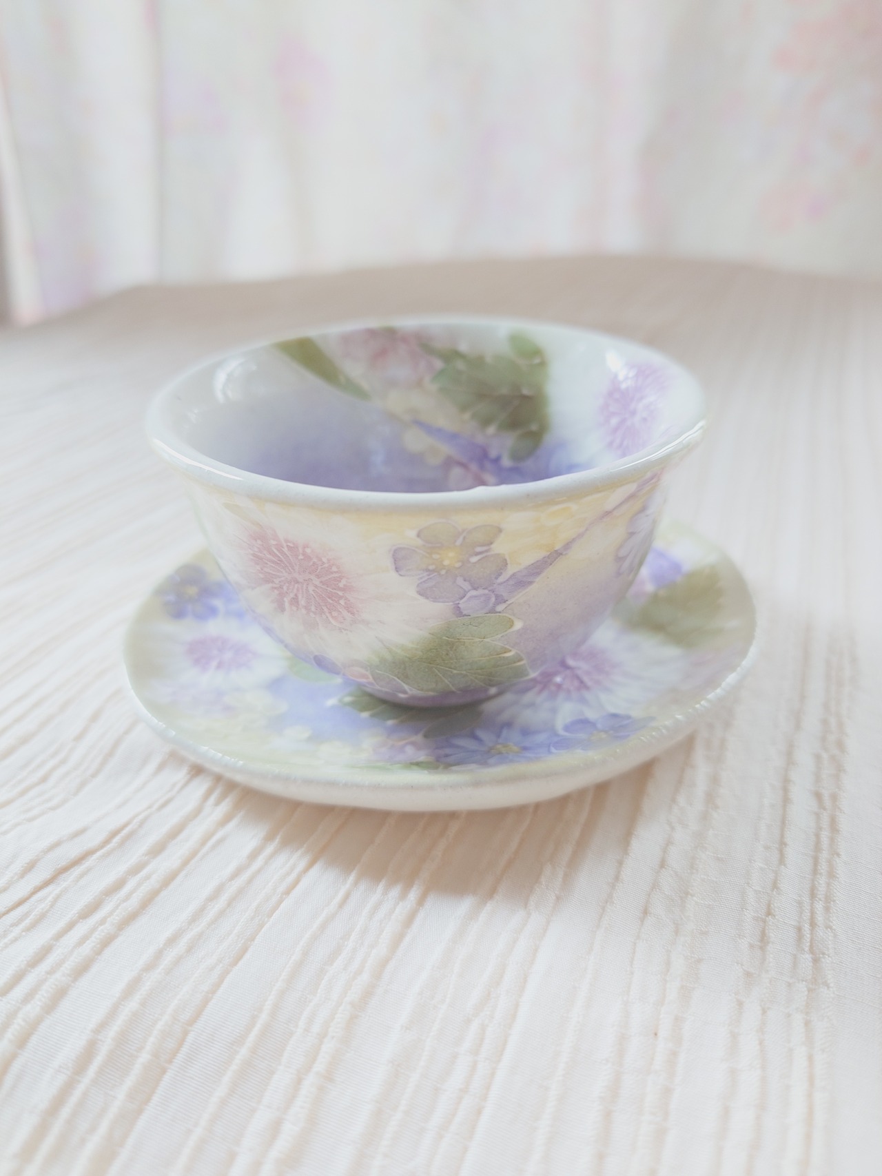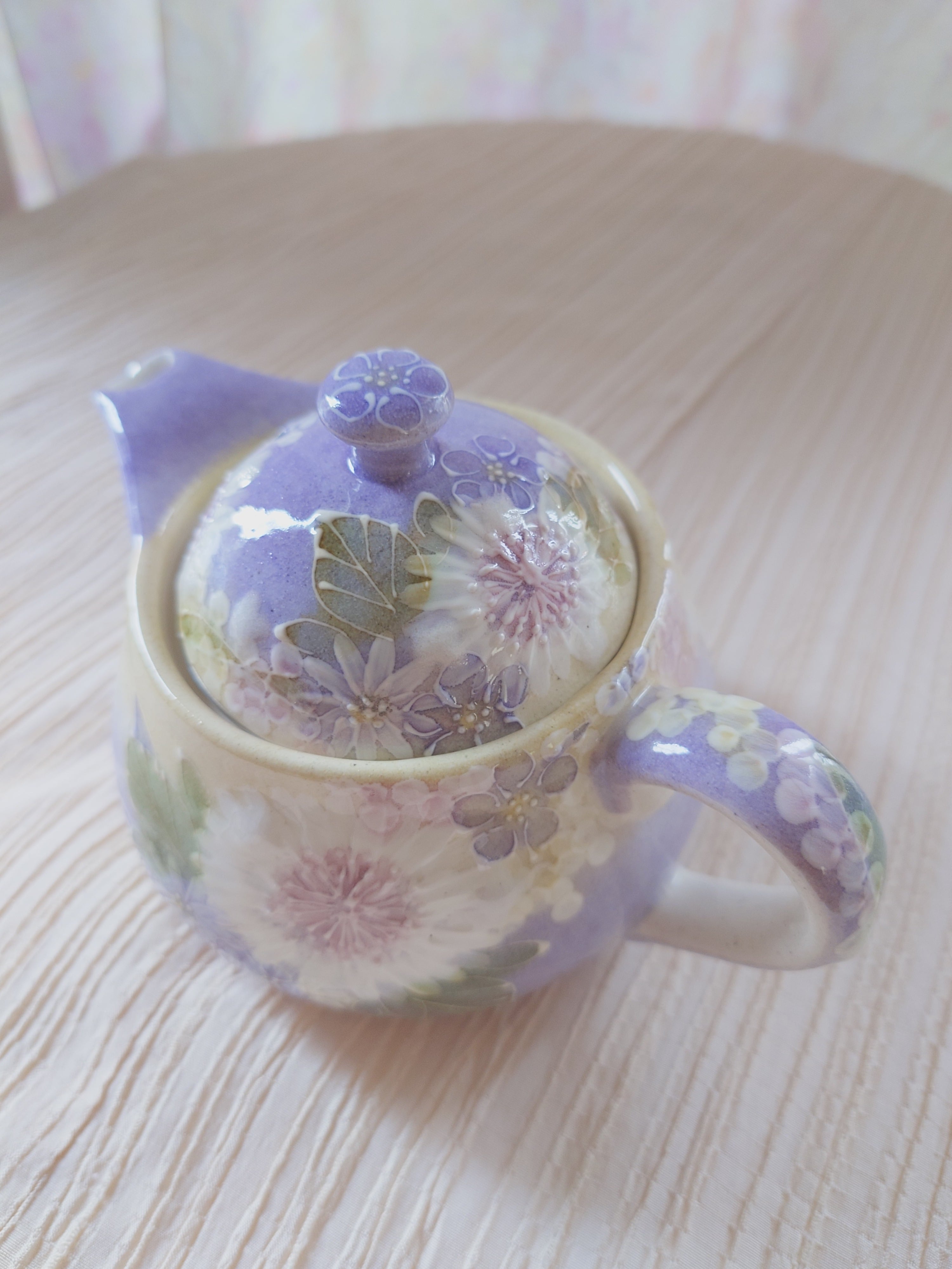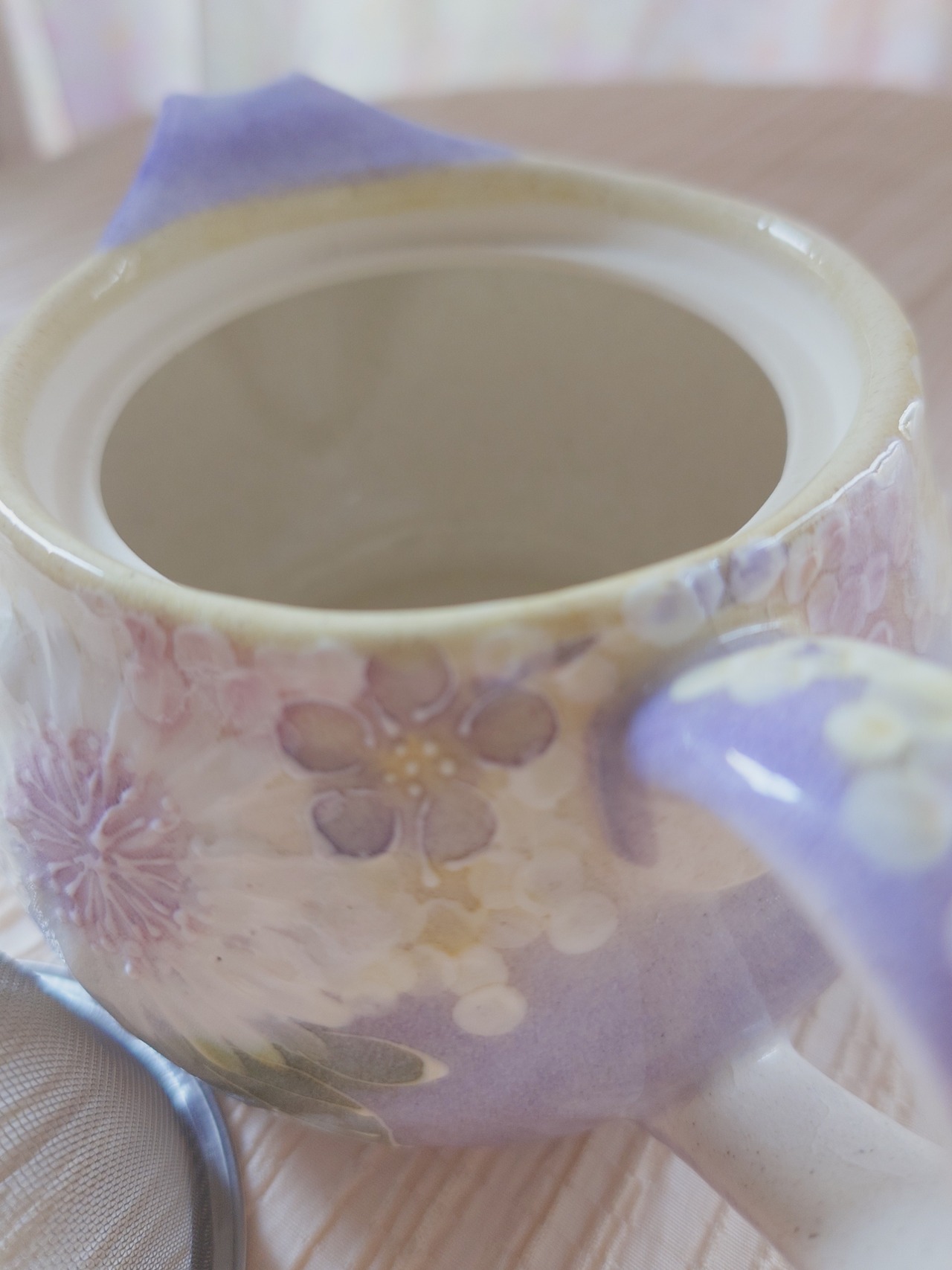 工房ゆずりは 丸ポットと茶菓セット 紫を主体にした華やかで落ち着いた上品な絵柄