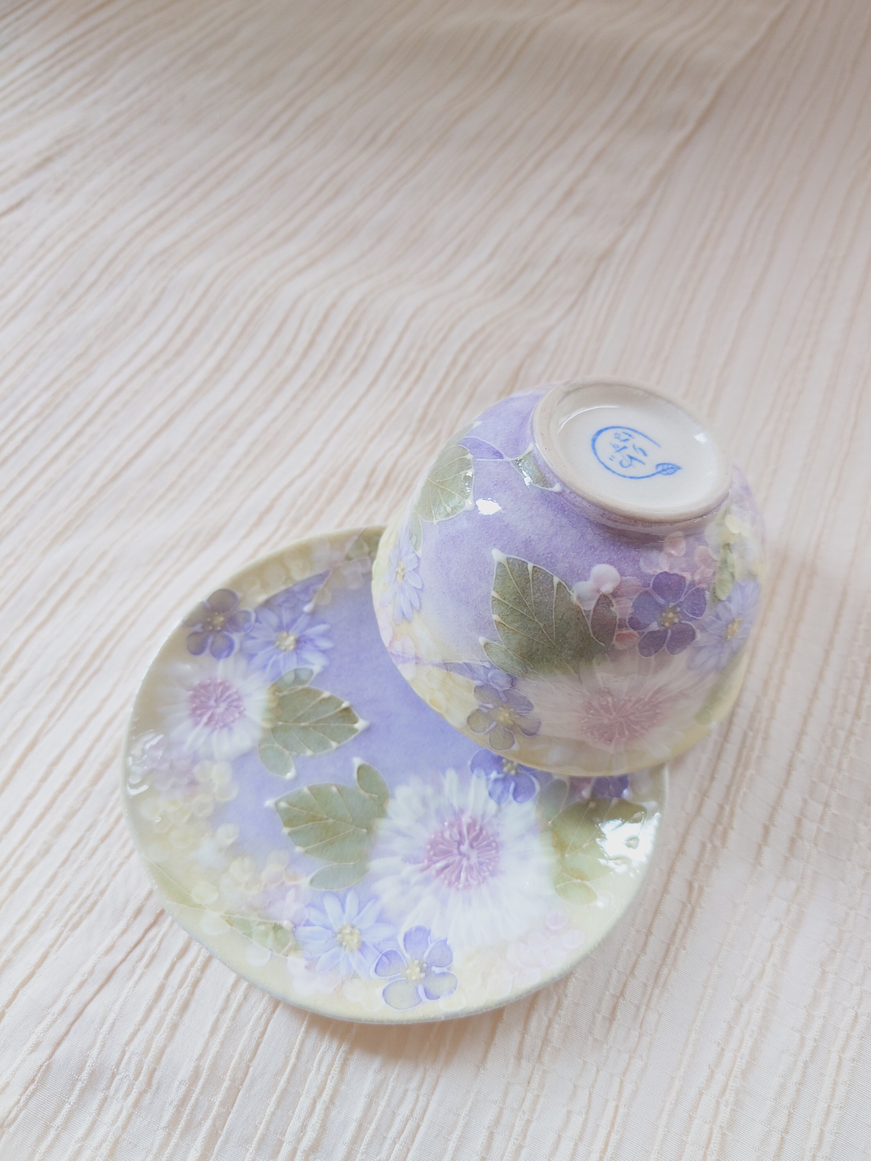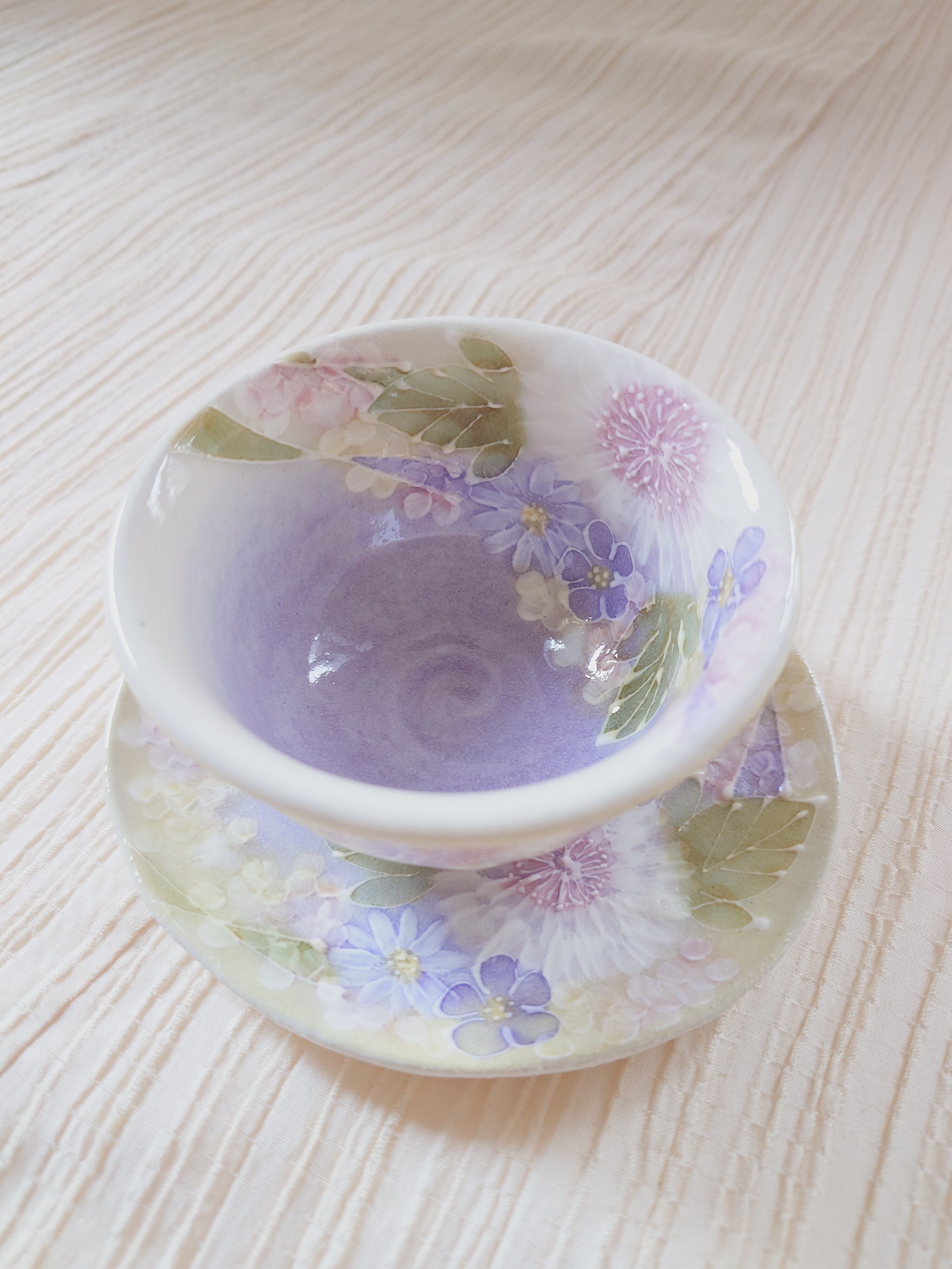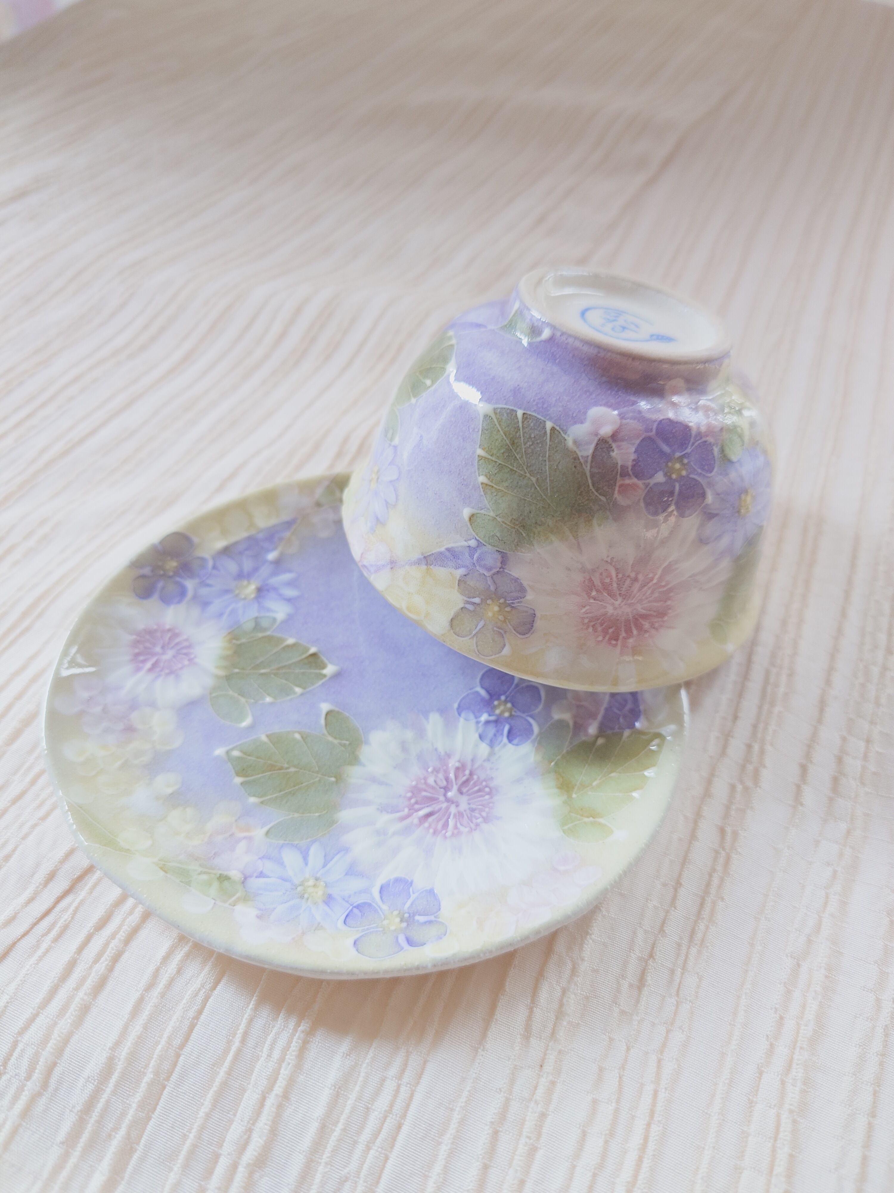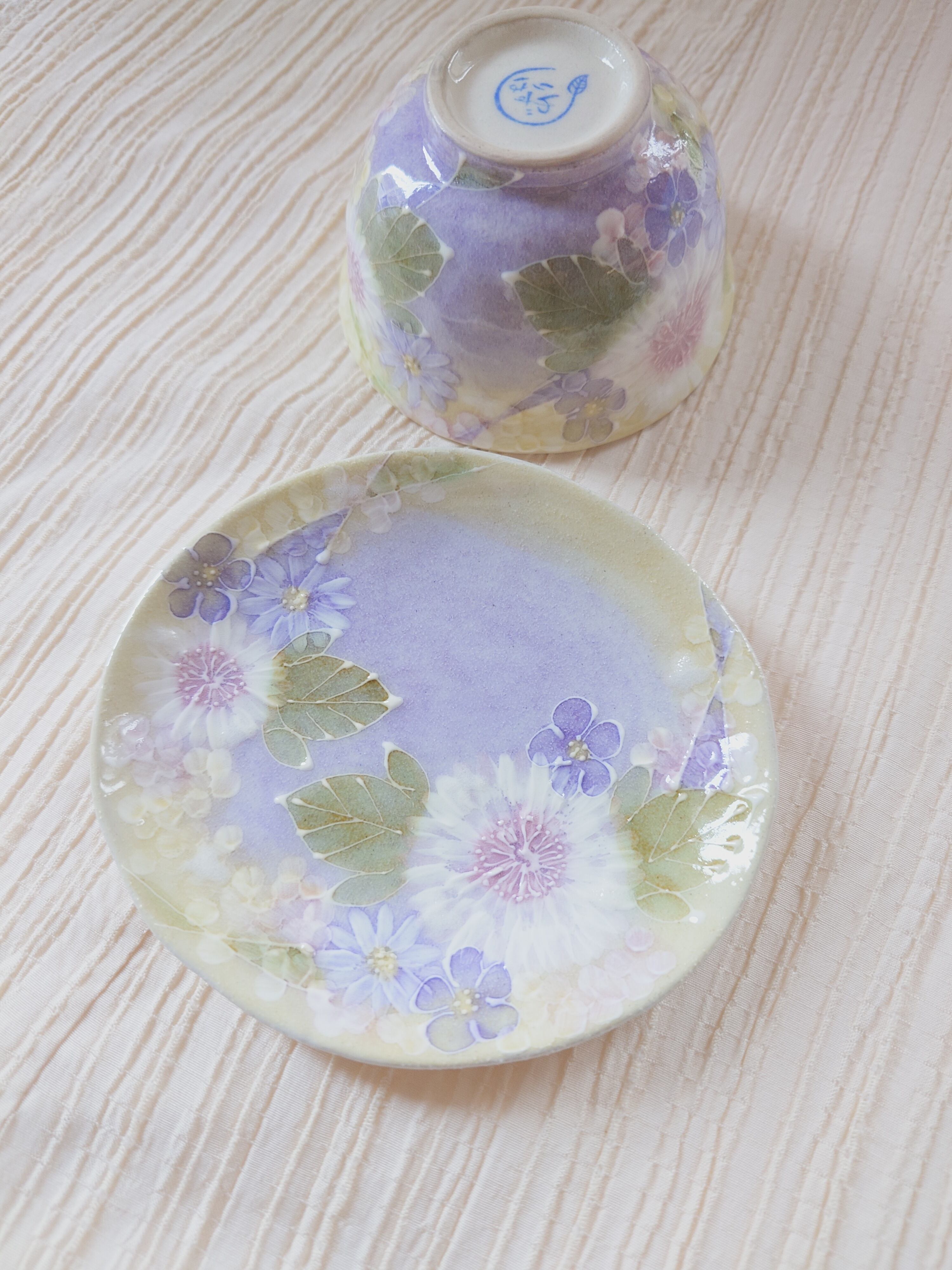 工房ゆずりは 茶菓セット 紫を主体にした華やかで落ち着いた上品な絵柄
