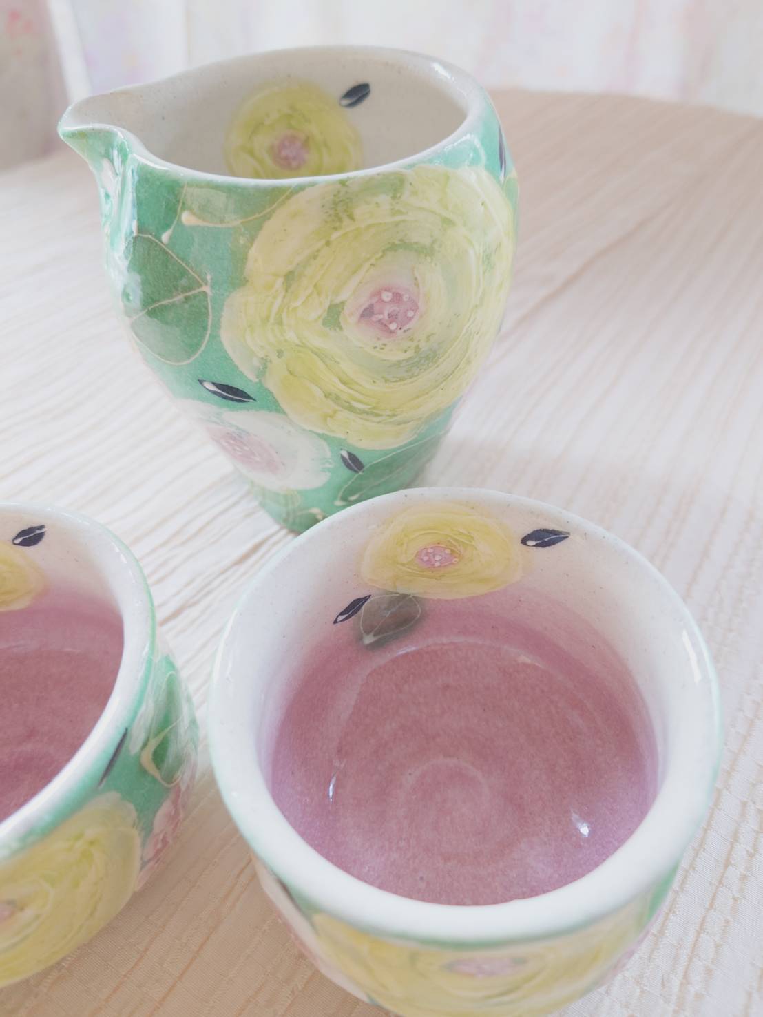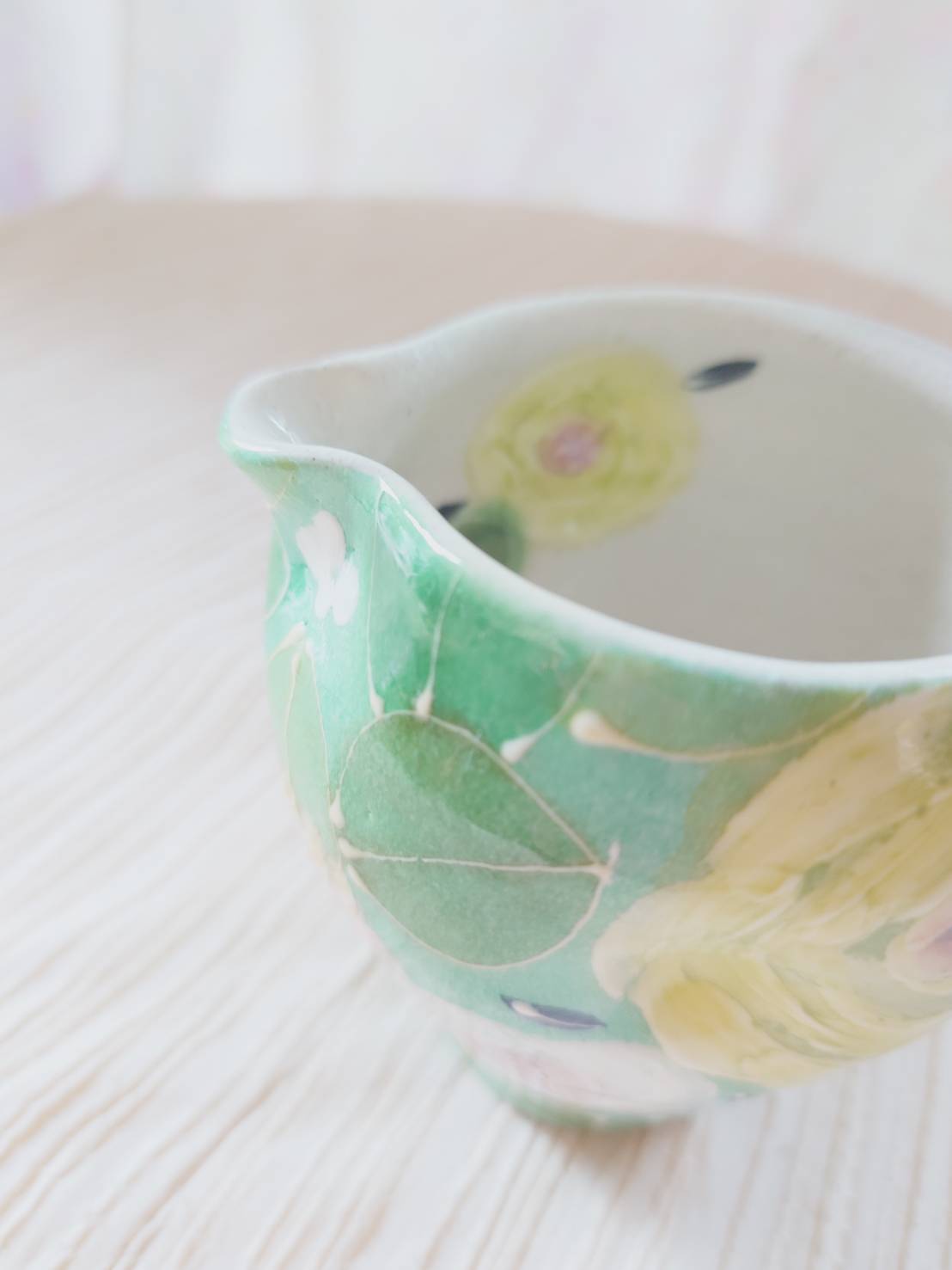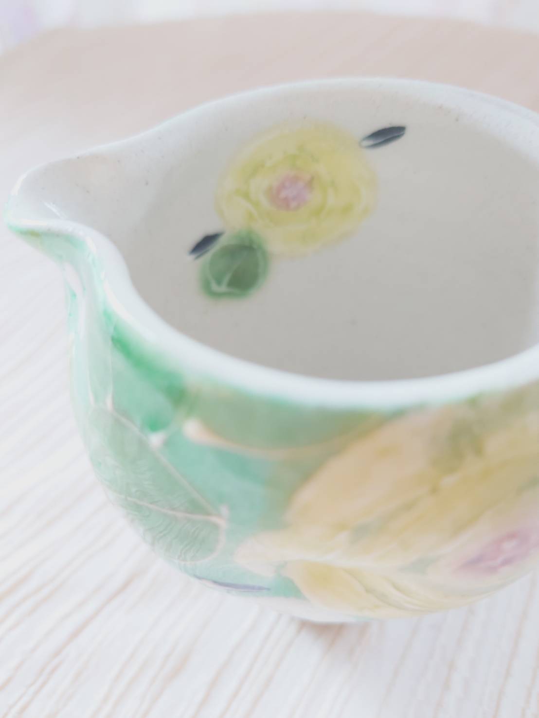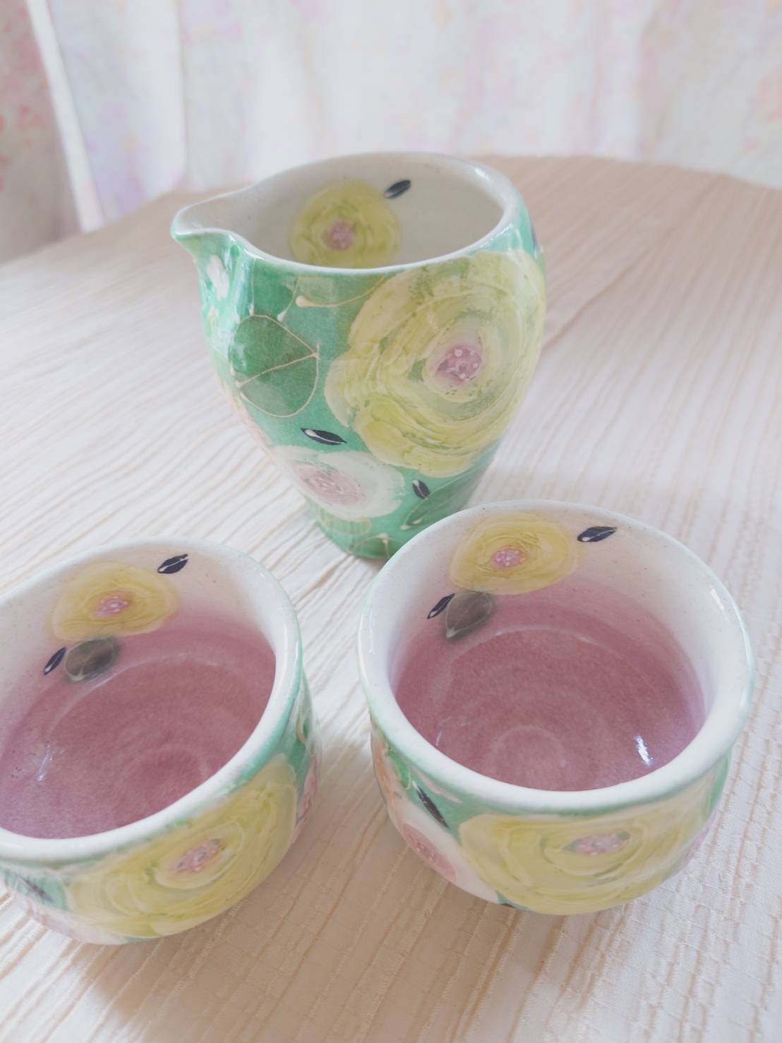 工房ゆずりは 酒器セット 鮮やかなグリーンとデフォルメされた黄色のバラが印象的な 緑彩ローズ 片口1個 ぐい吞み2個大