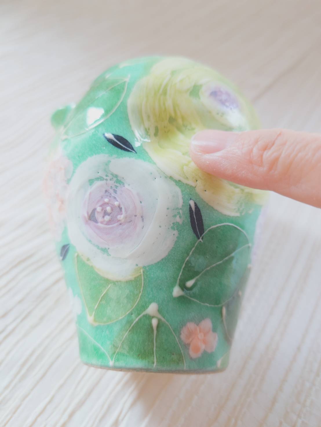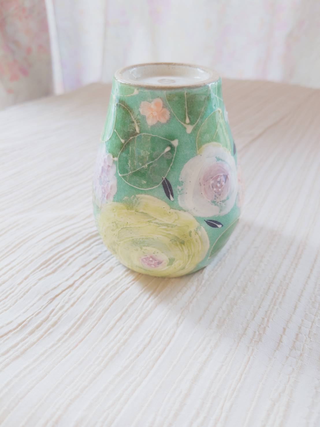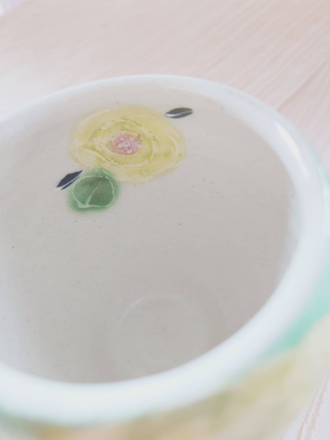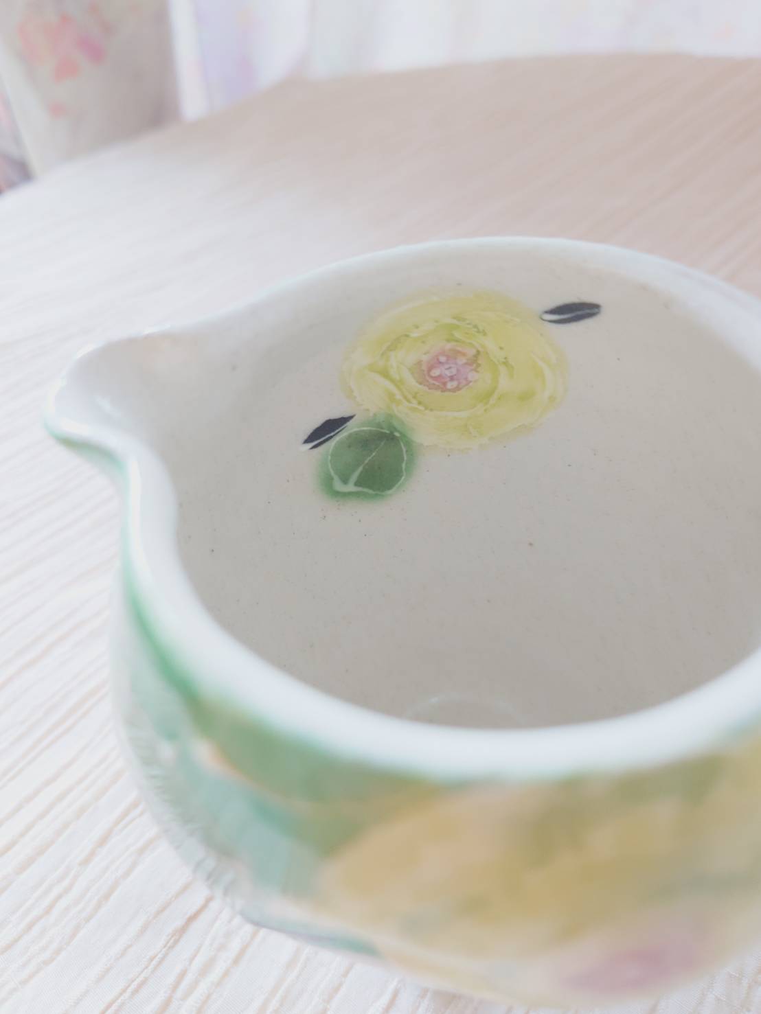 工房ゆずりは 酒器セット 鮮やかなグリーンとデフォルメされた黄色のバラが印象的な 緑彩ローズ 片口1個 ぐい吞み2個大