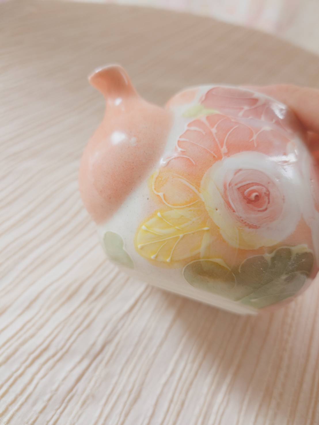 工房ゆずりは プチポット デフォルメされたピンクの薔薇が綺麗なうつわ 釉彩ローズ