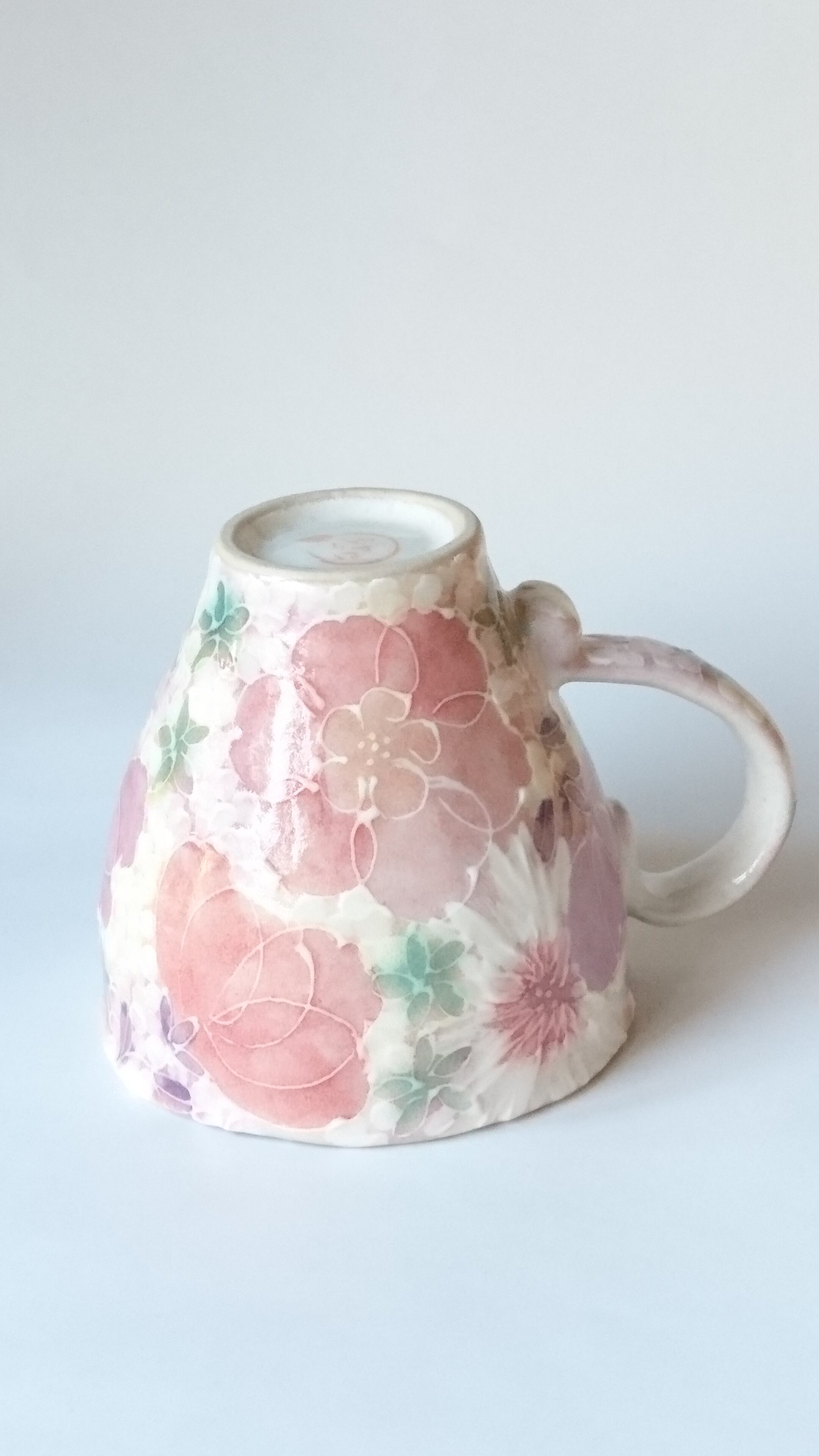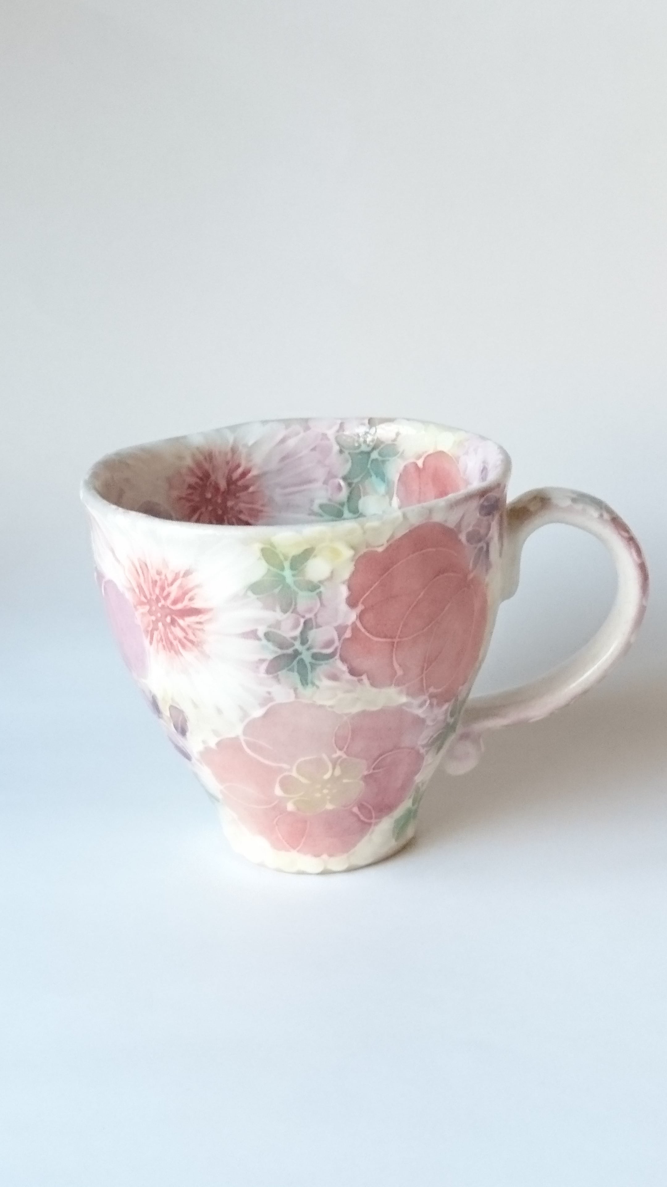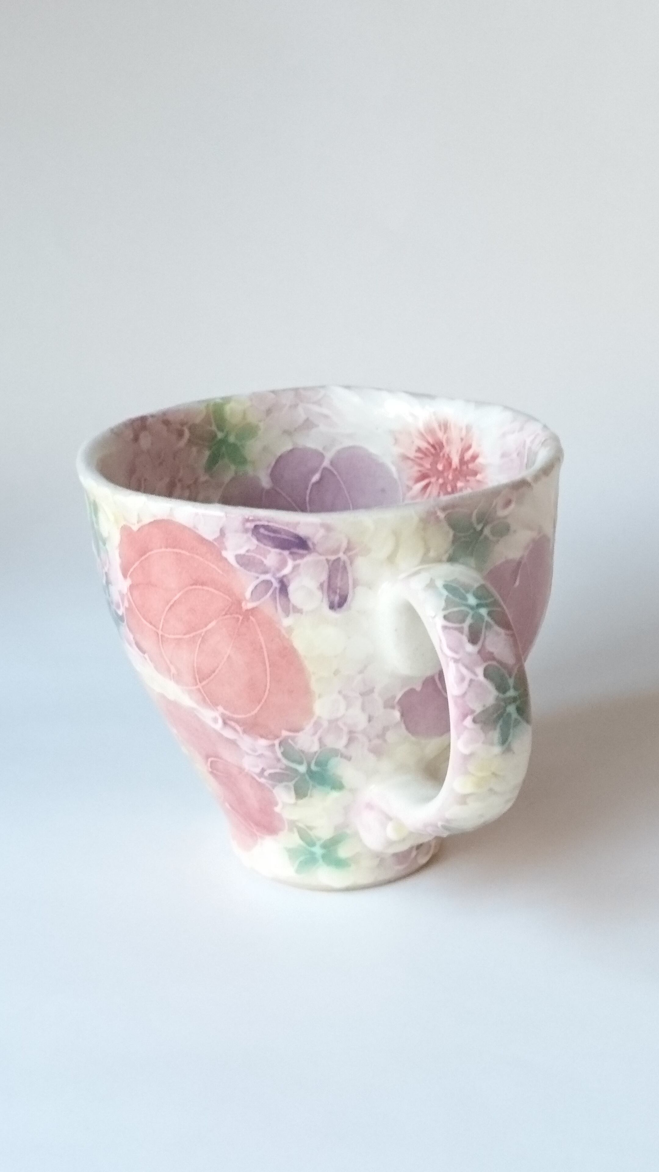 工房ゆずりは マグカップ 紅色や赤紫系の花柄と繊細な白い花が印象的 薄紅色絵花 44012