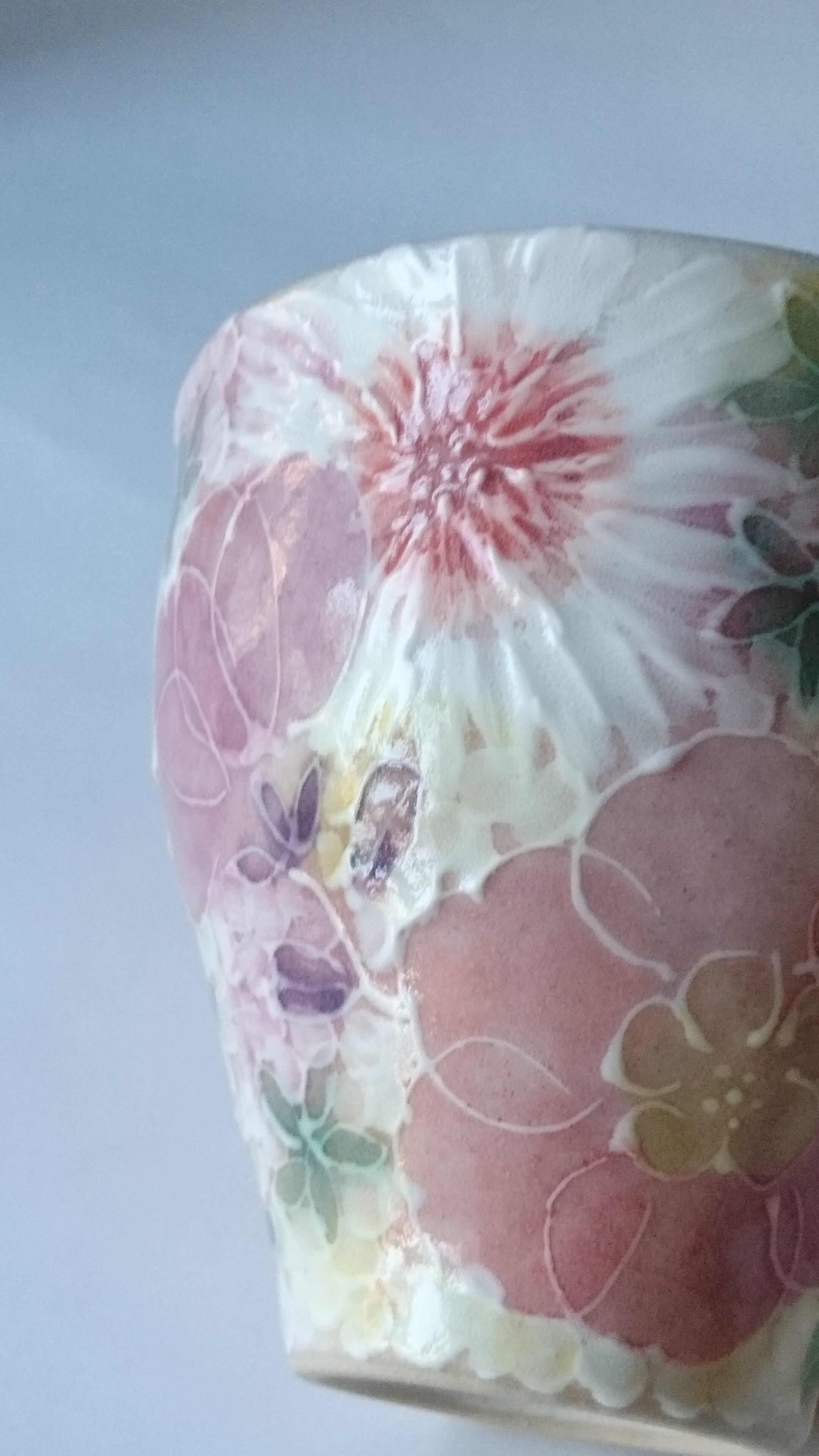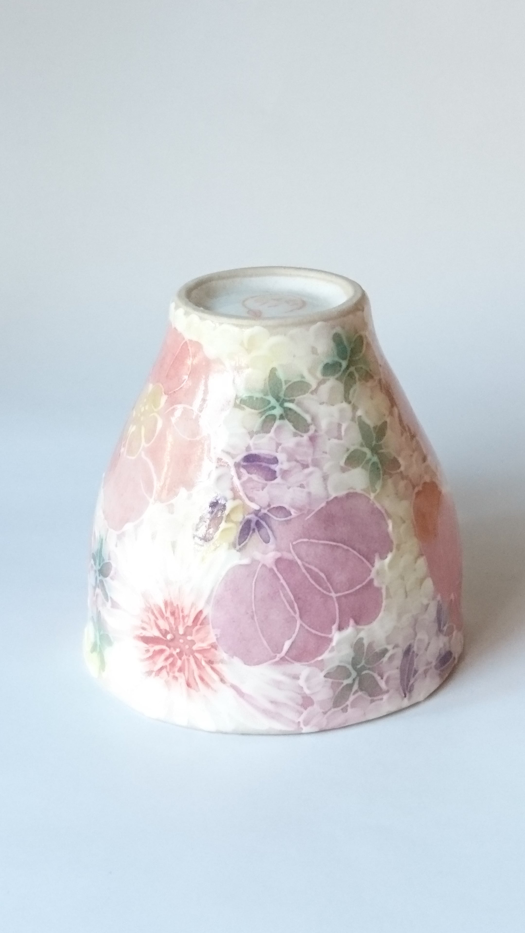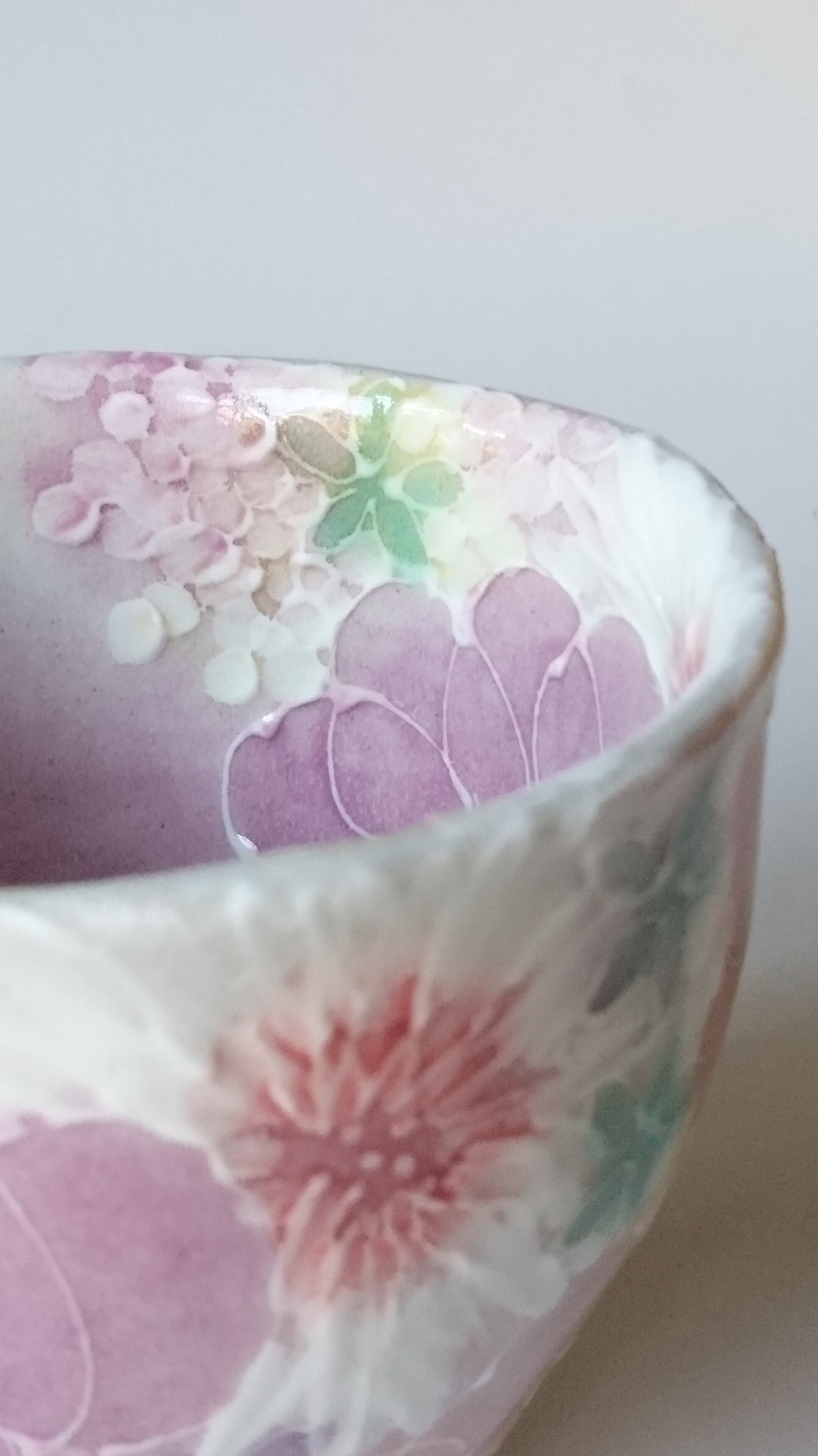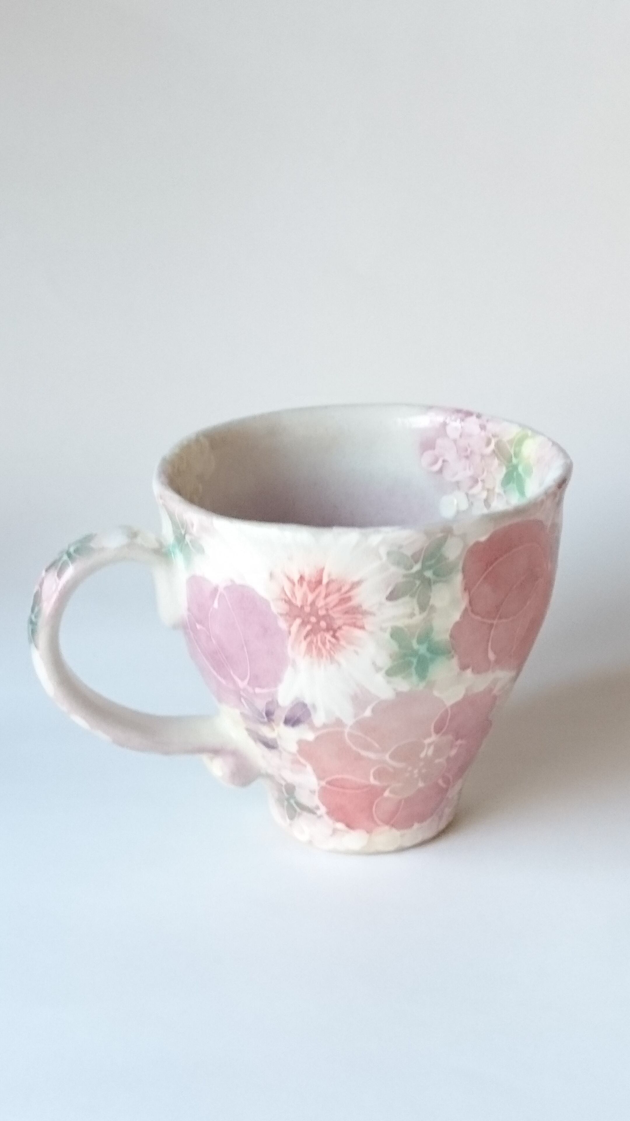 工房ゆずりは マグカップ 紅色や赤紫系の花柄と繊細な白い花が印象的 薄紅色絵花 44012