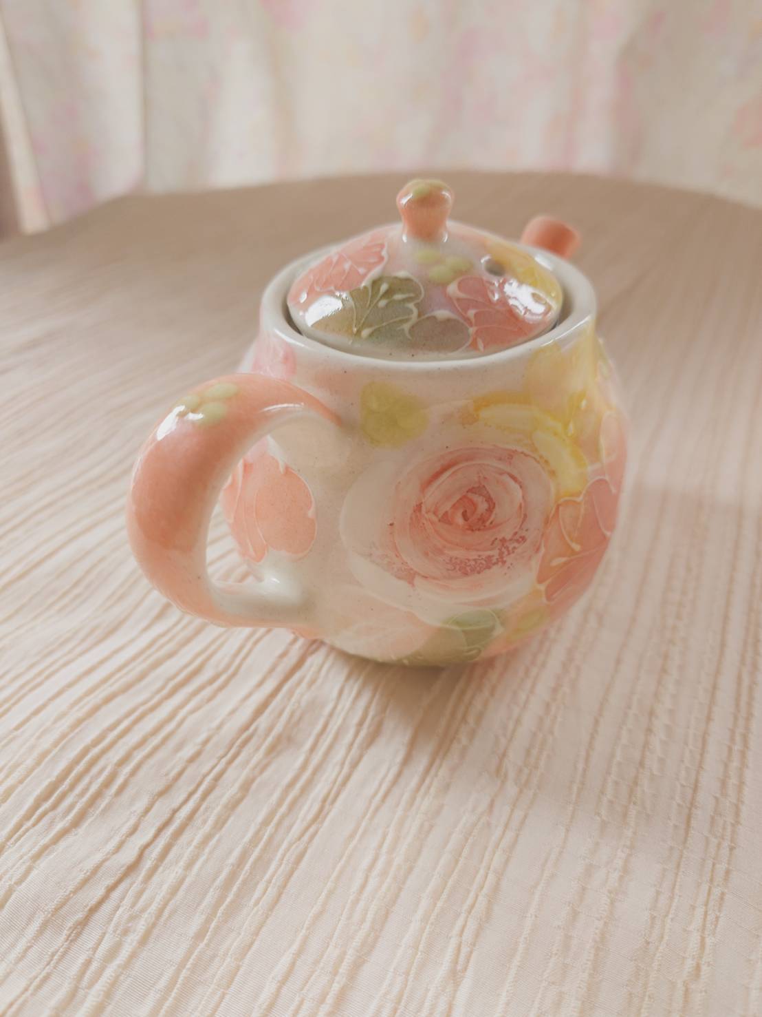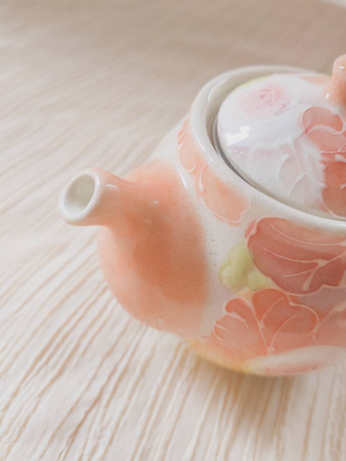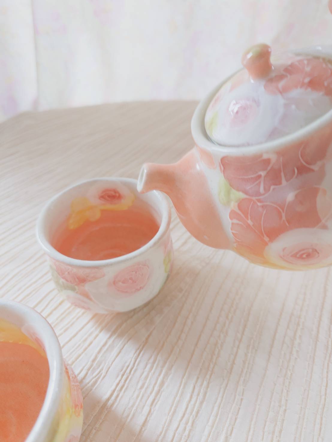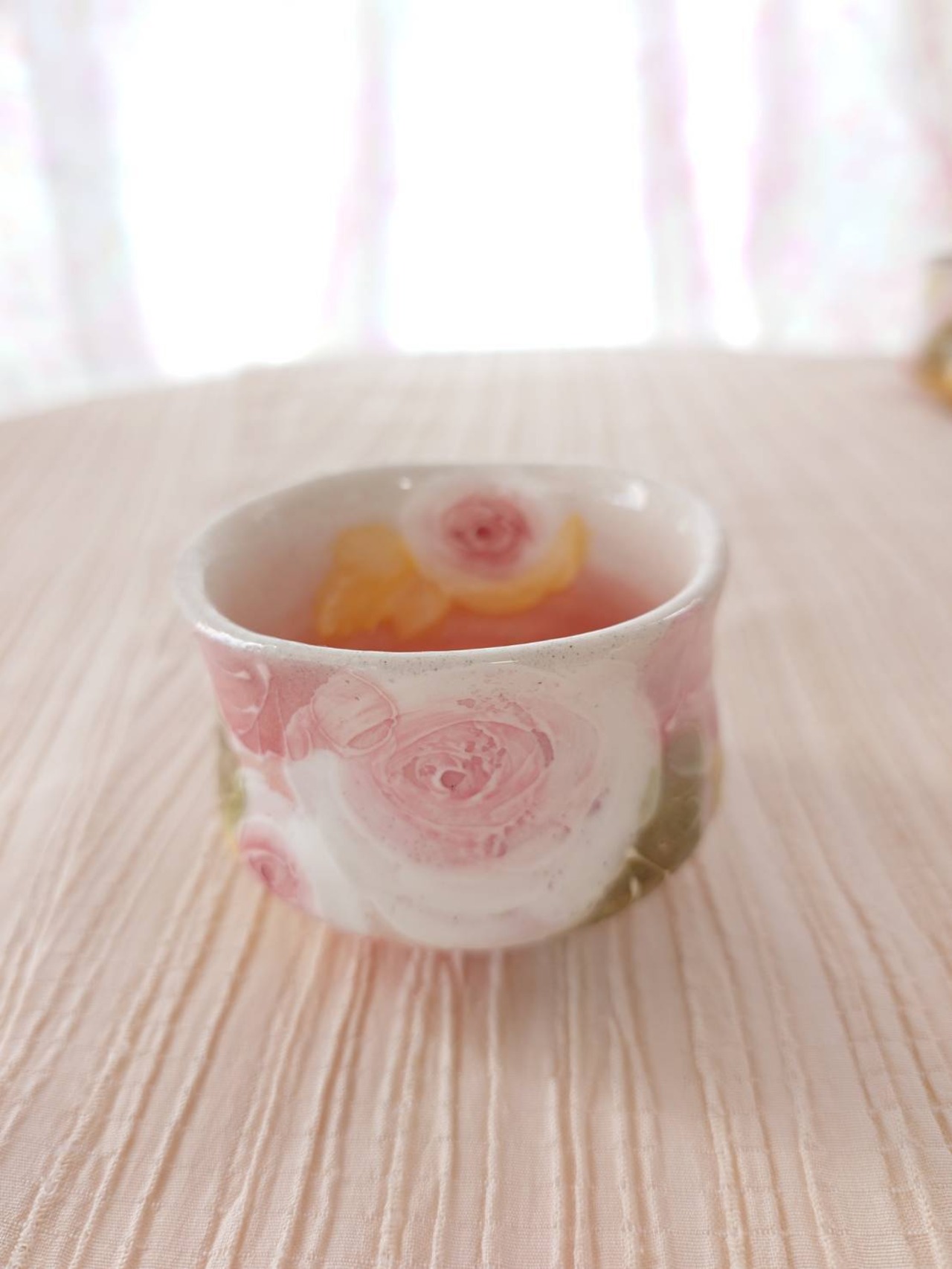 工房ゆずりは プチポットとぐい吞みセット デフォルメされたピンクの薔薇が綺麗なうつわ 釉彩ローズ プチポット1個ぐい吞み大2個