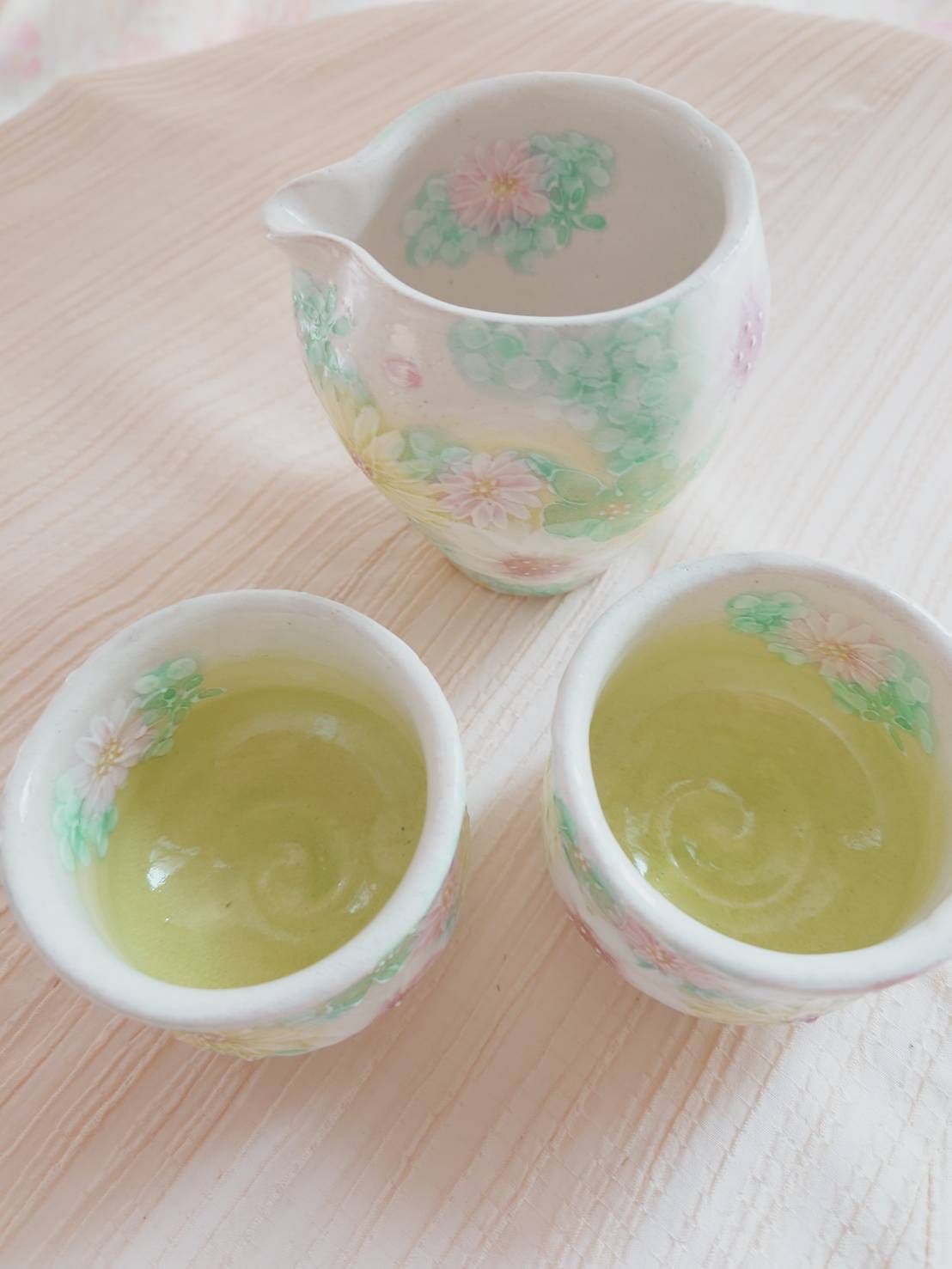 グリーンの繊細な絵柄が大人気の彩小花紋の片口とぐい吞みのセット