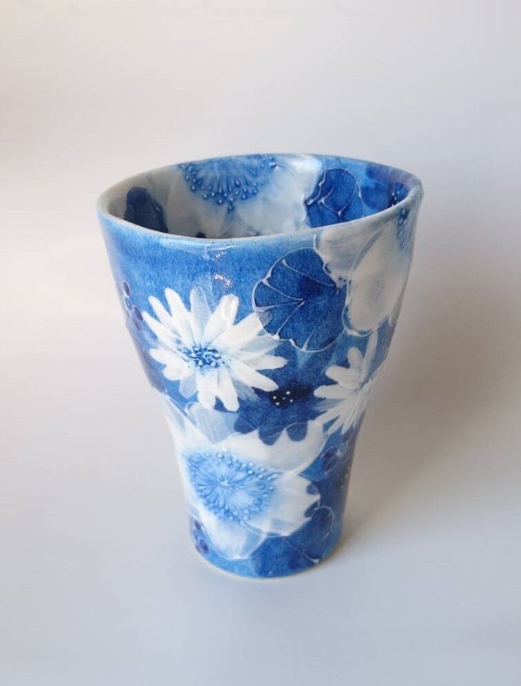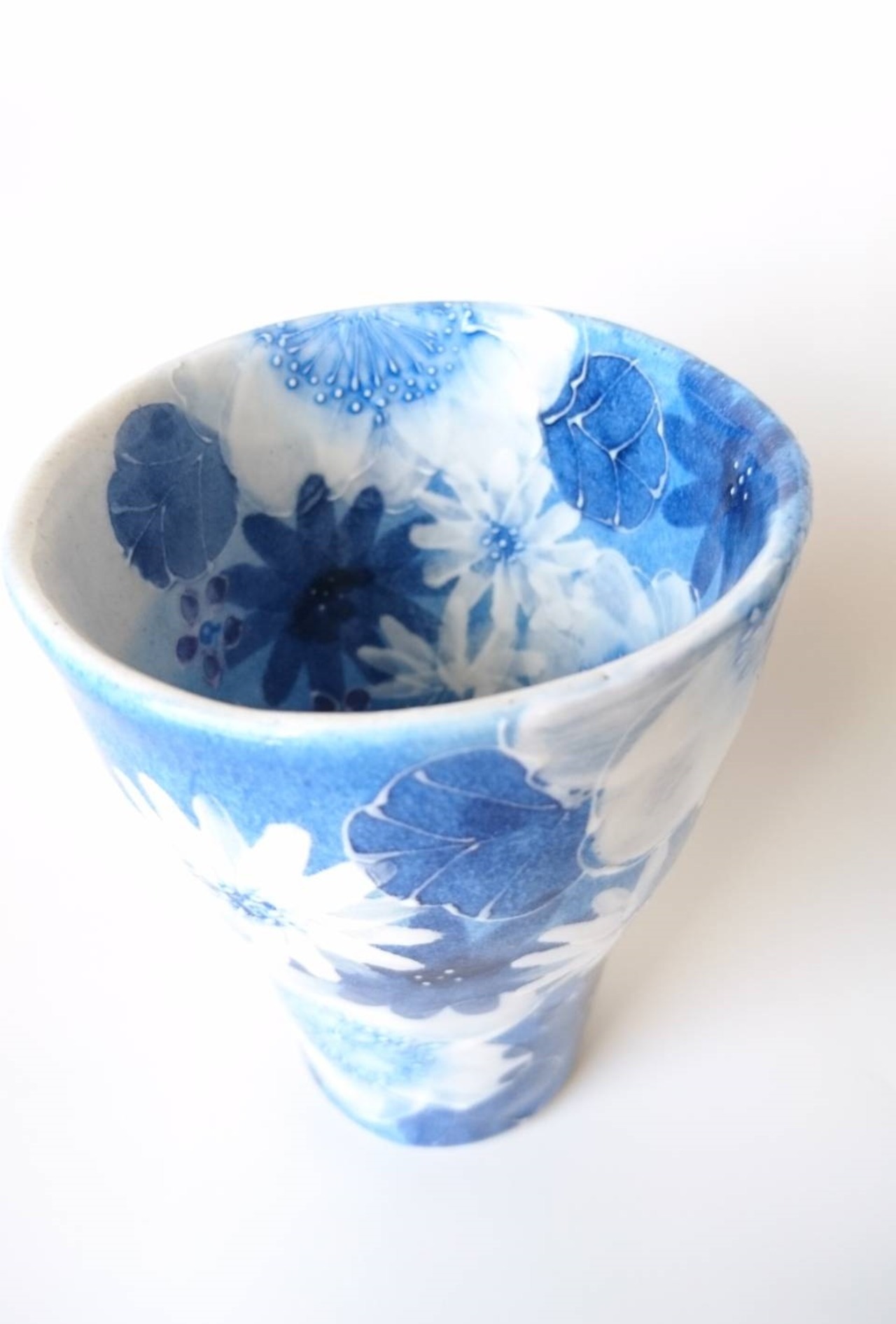 工房ゆずりは 陶コップ 鮮やかな青が清涼感と高級感を醸し出します 藍彩白絵花 44962