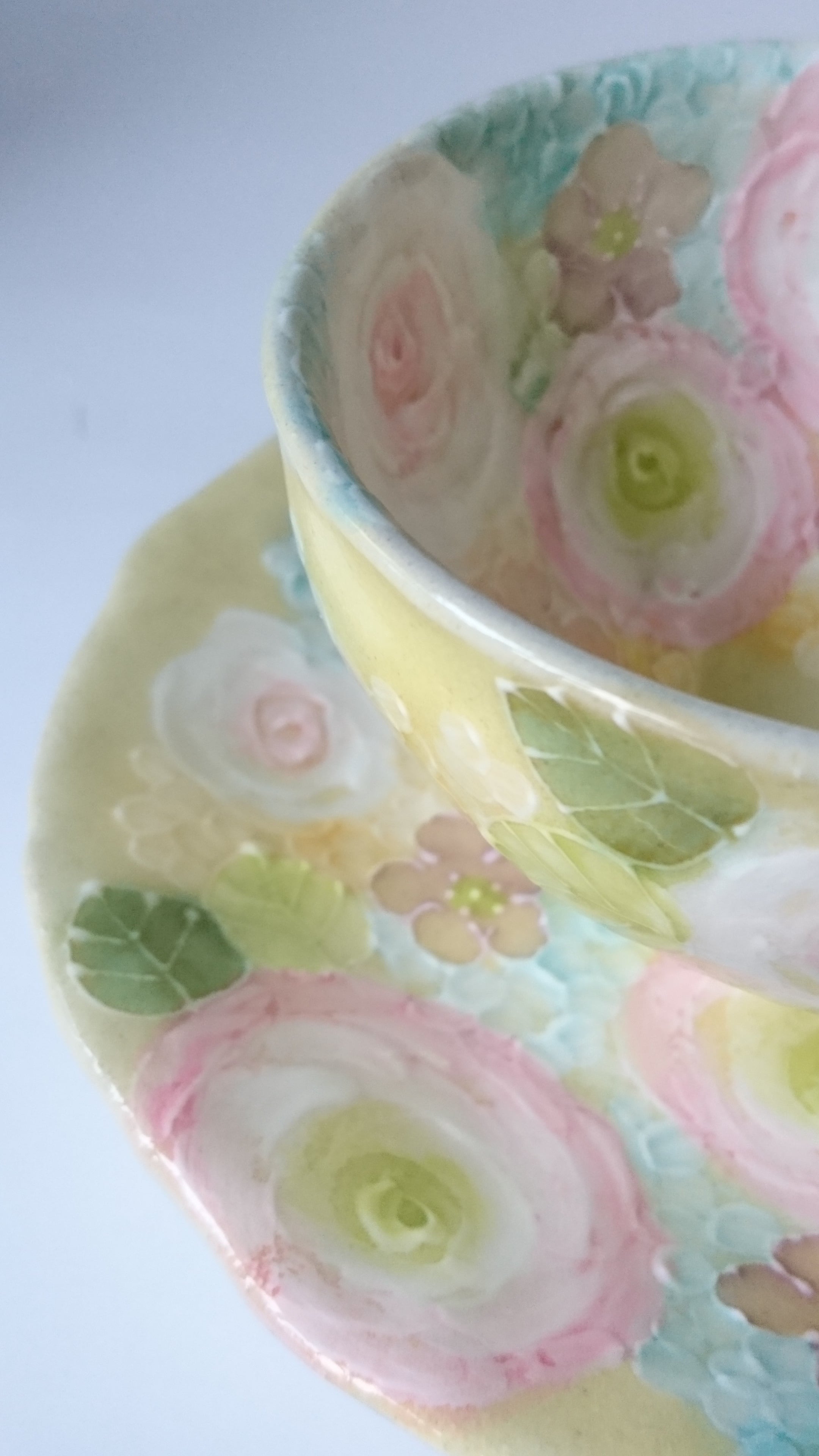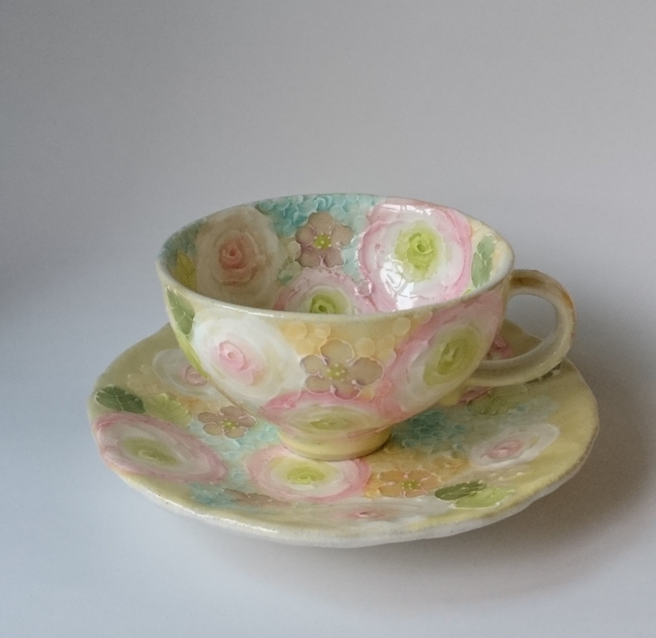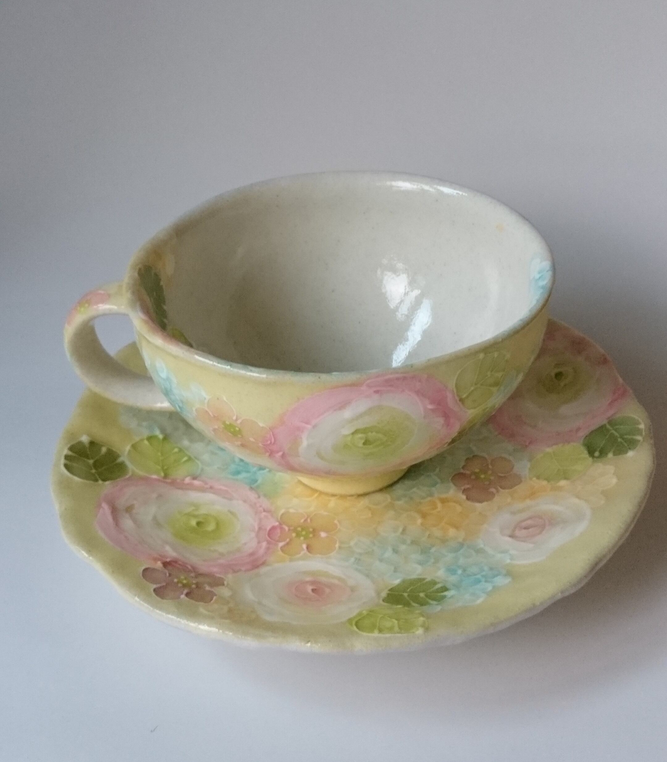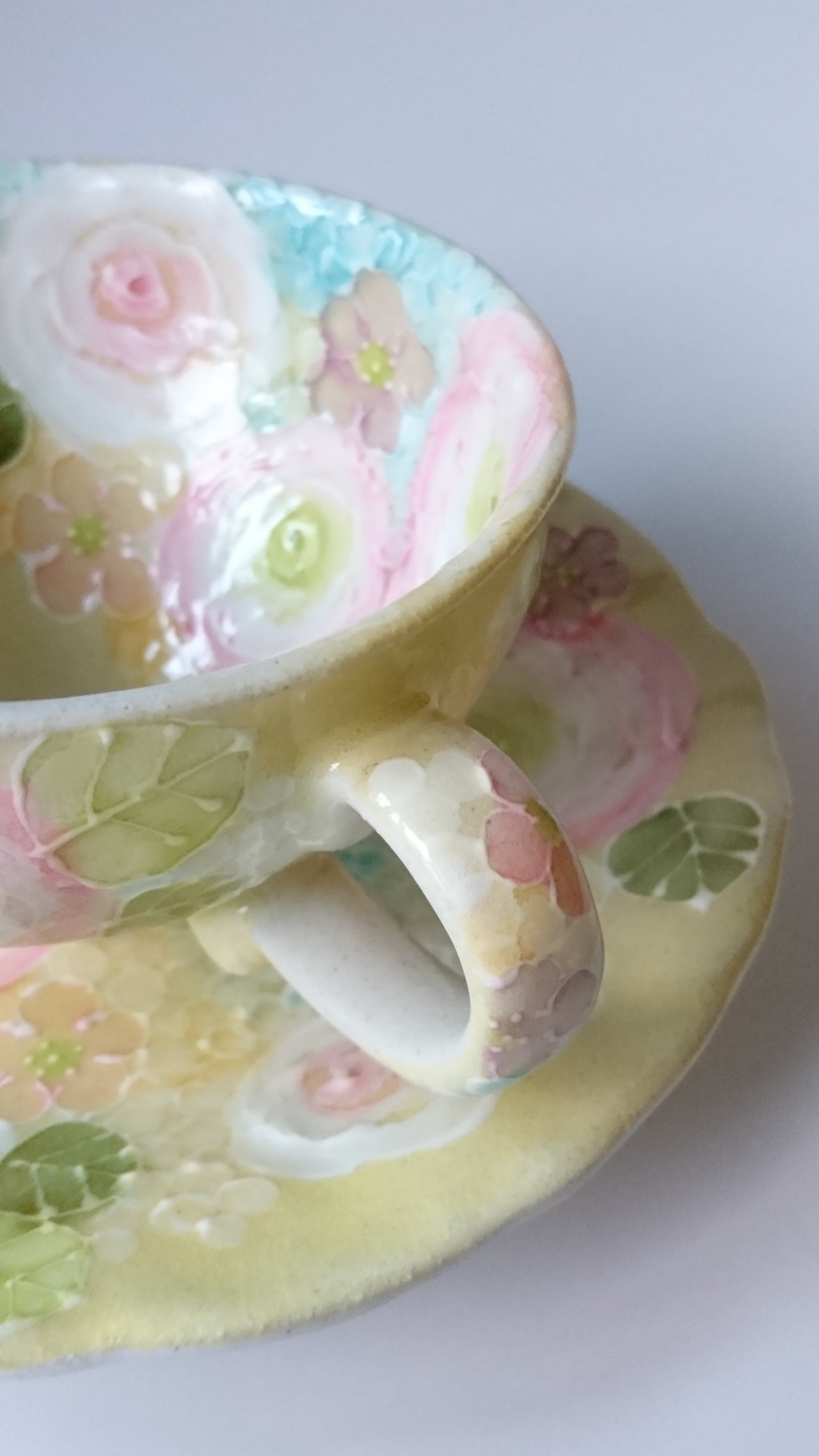 工房ゆずりは カップ&ソーサー 黄色の地にピンクの縁取りの薔薇やグリーンが明るい絵柄 黄彩花紋 49177