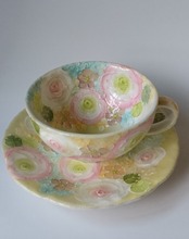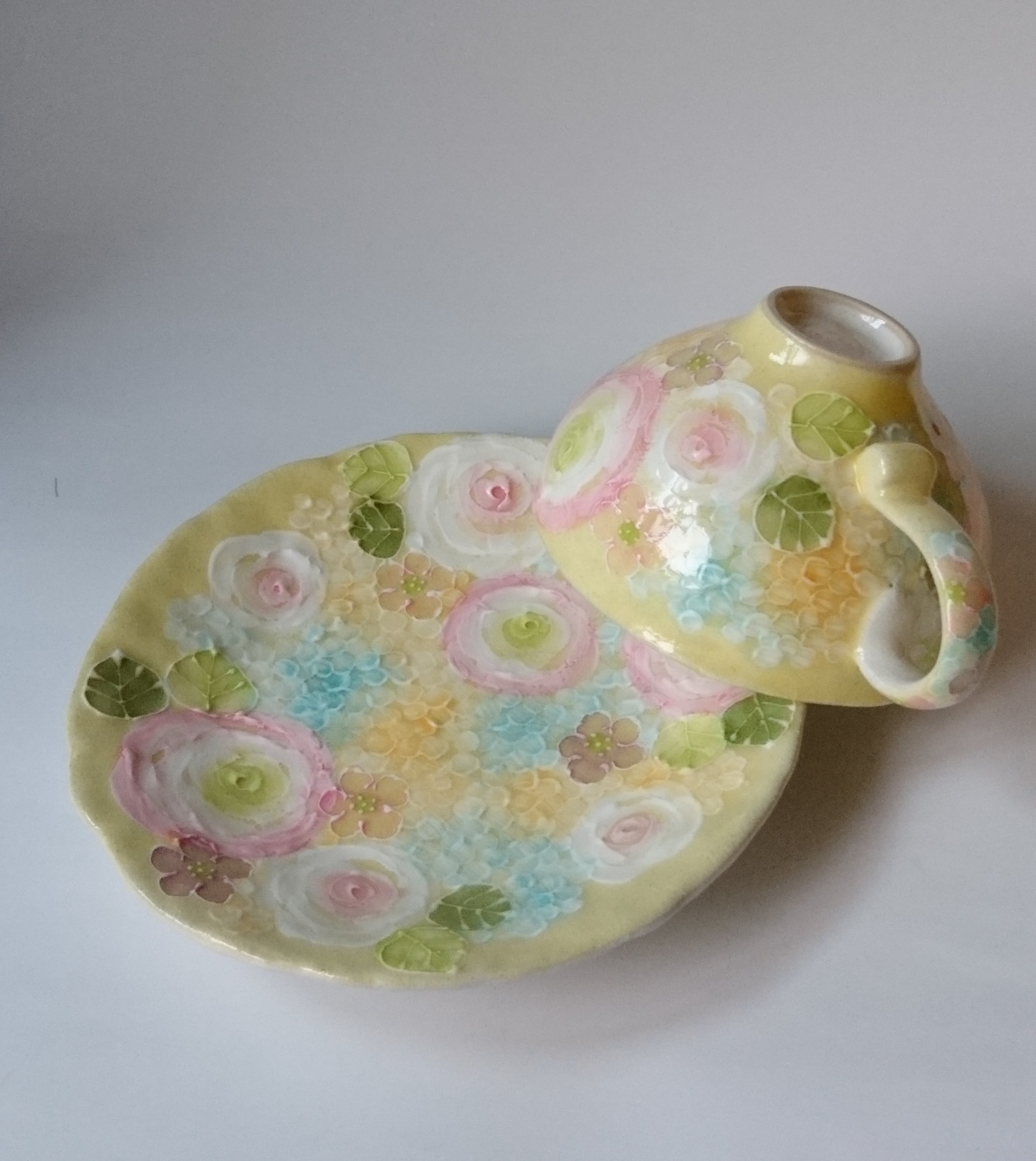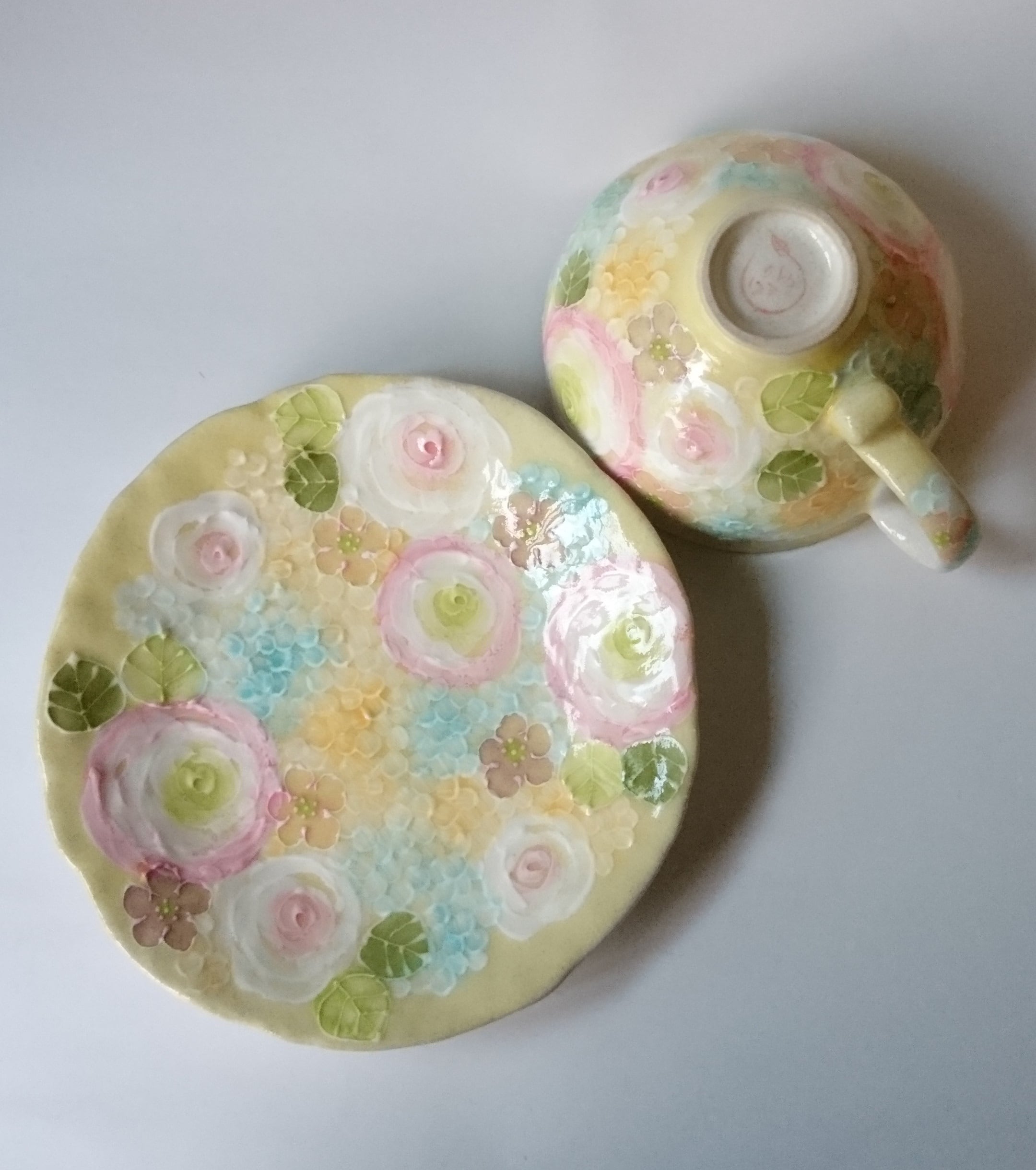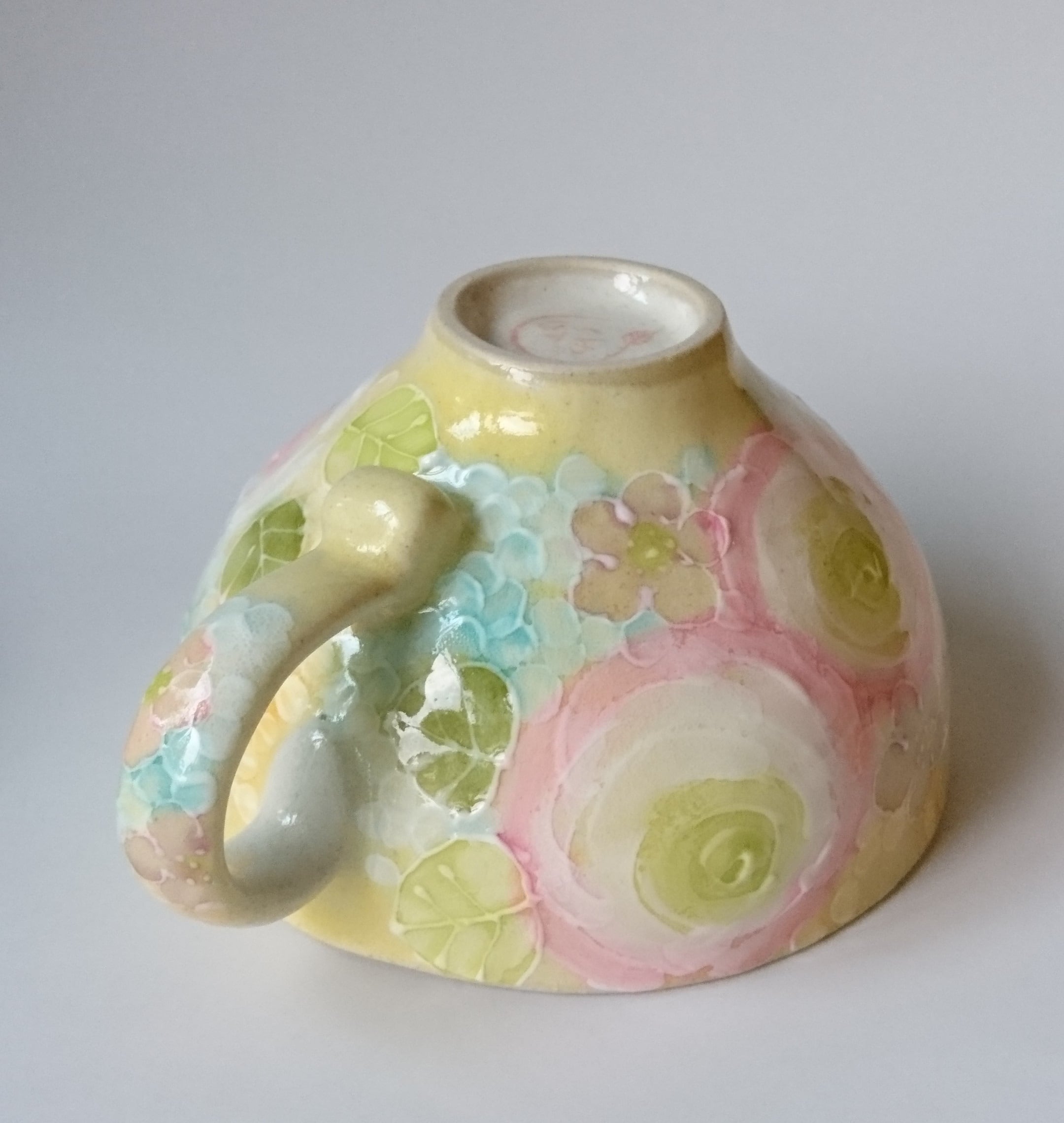 工房ゆずりは カップ&ソーサー 黄色の地にピンクの縁取りの薔薇やグリーンが明るい絵柄 黄彩花紋 49177