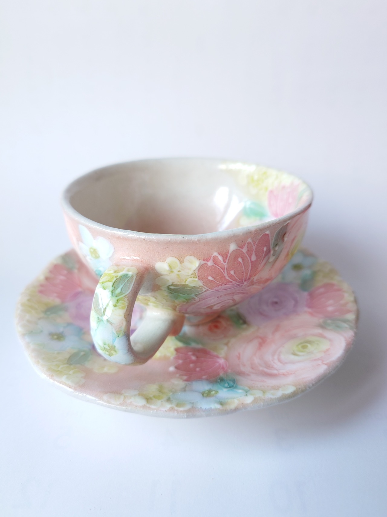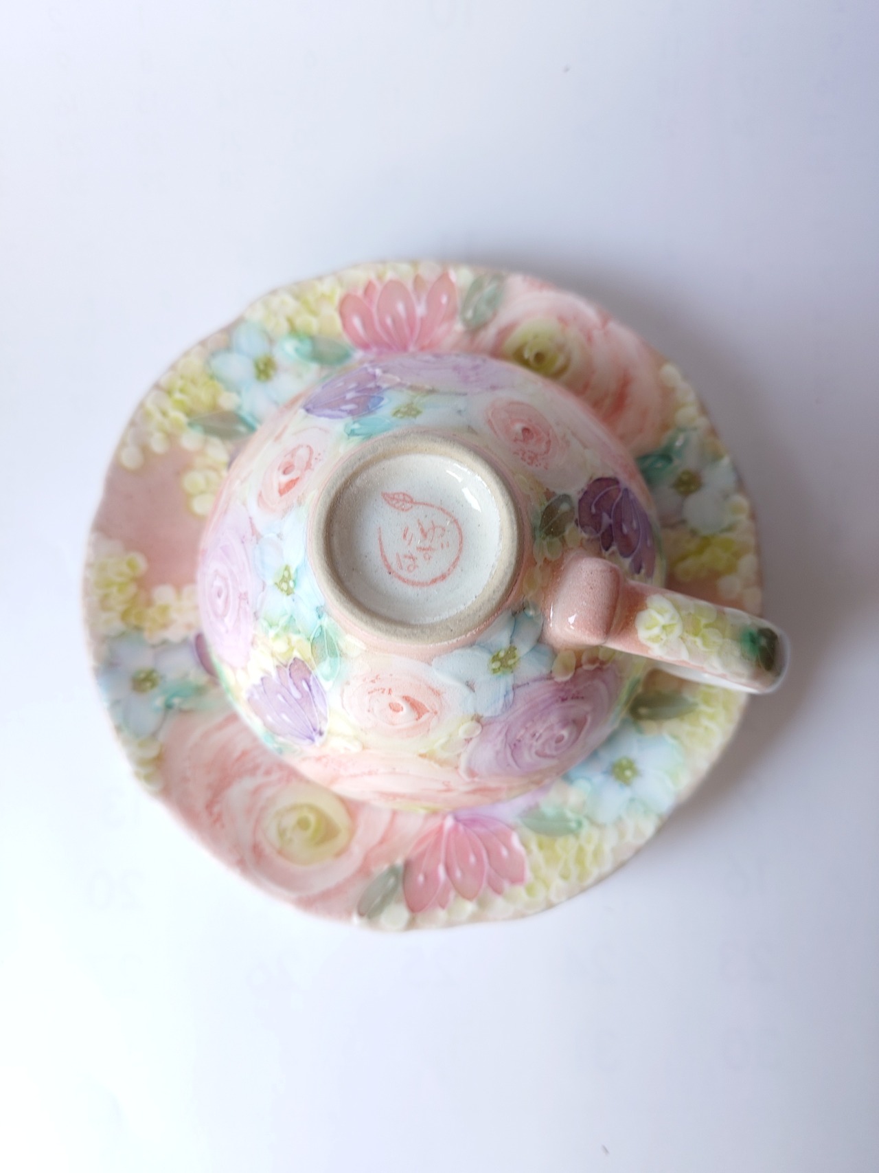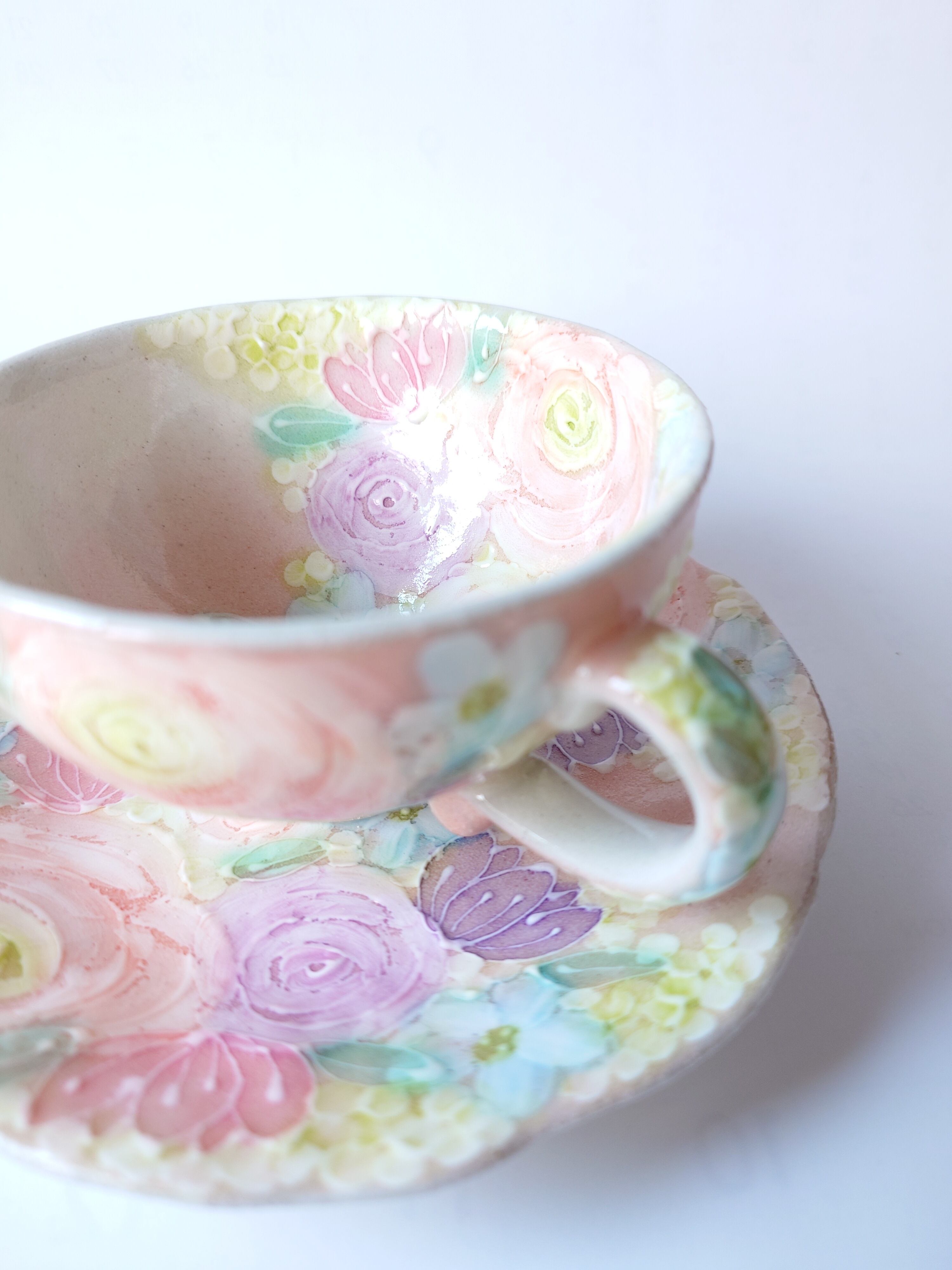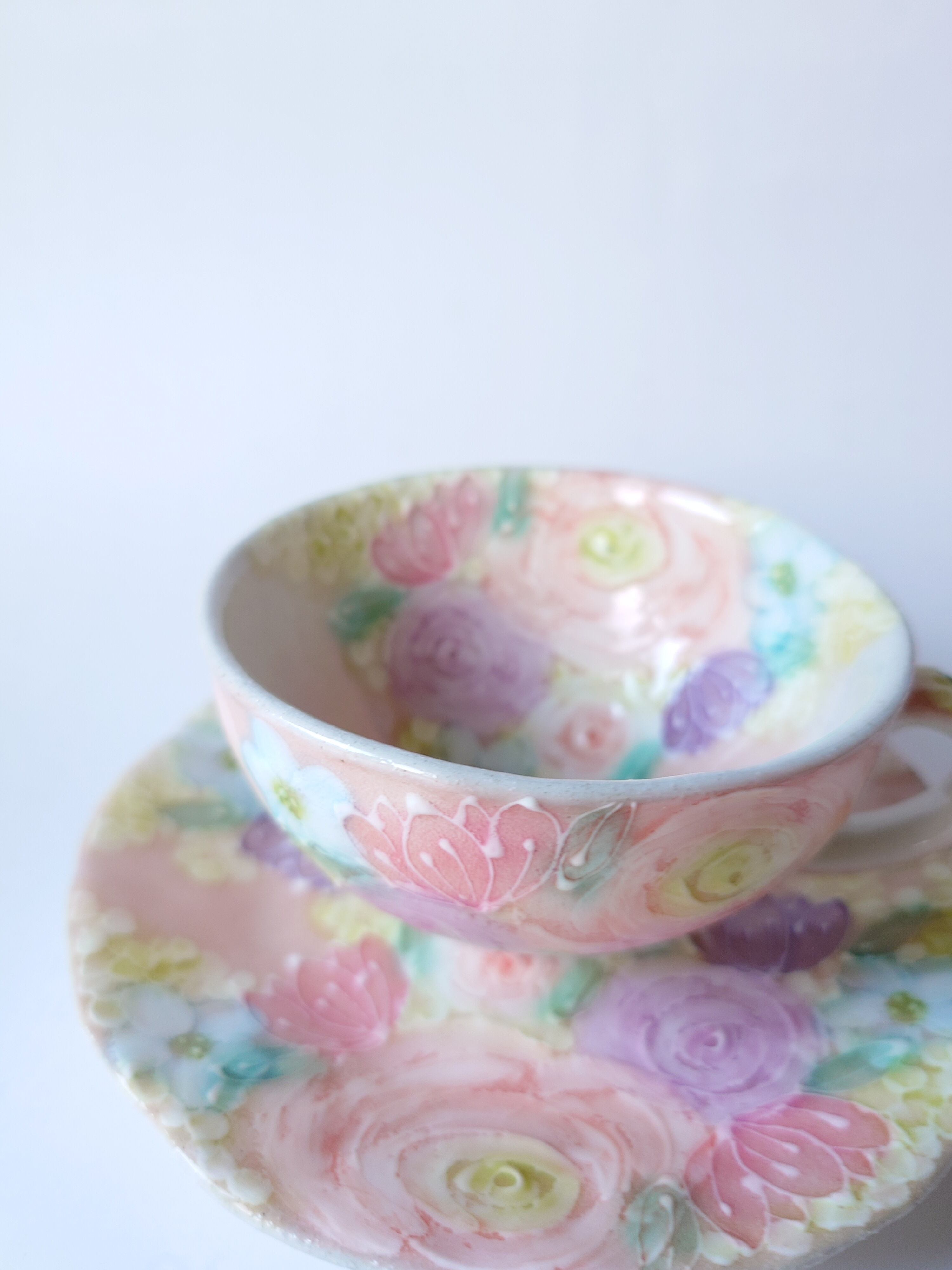 工房ゆずりは カップ&ソーサー ピン系のデフォルメされた薔薇がとても繊細 色彩優花 47037