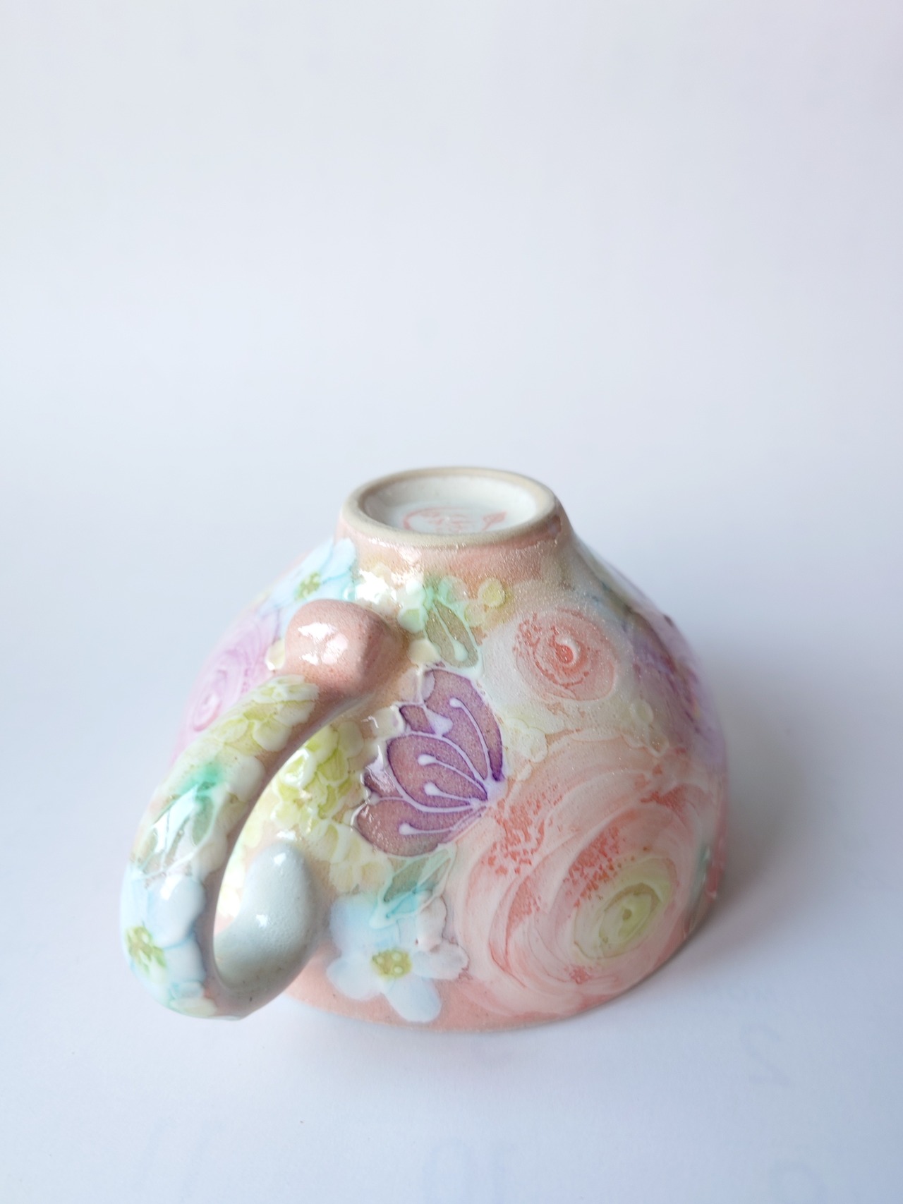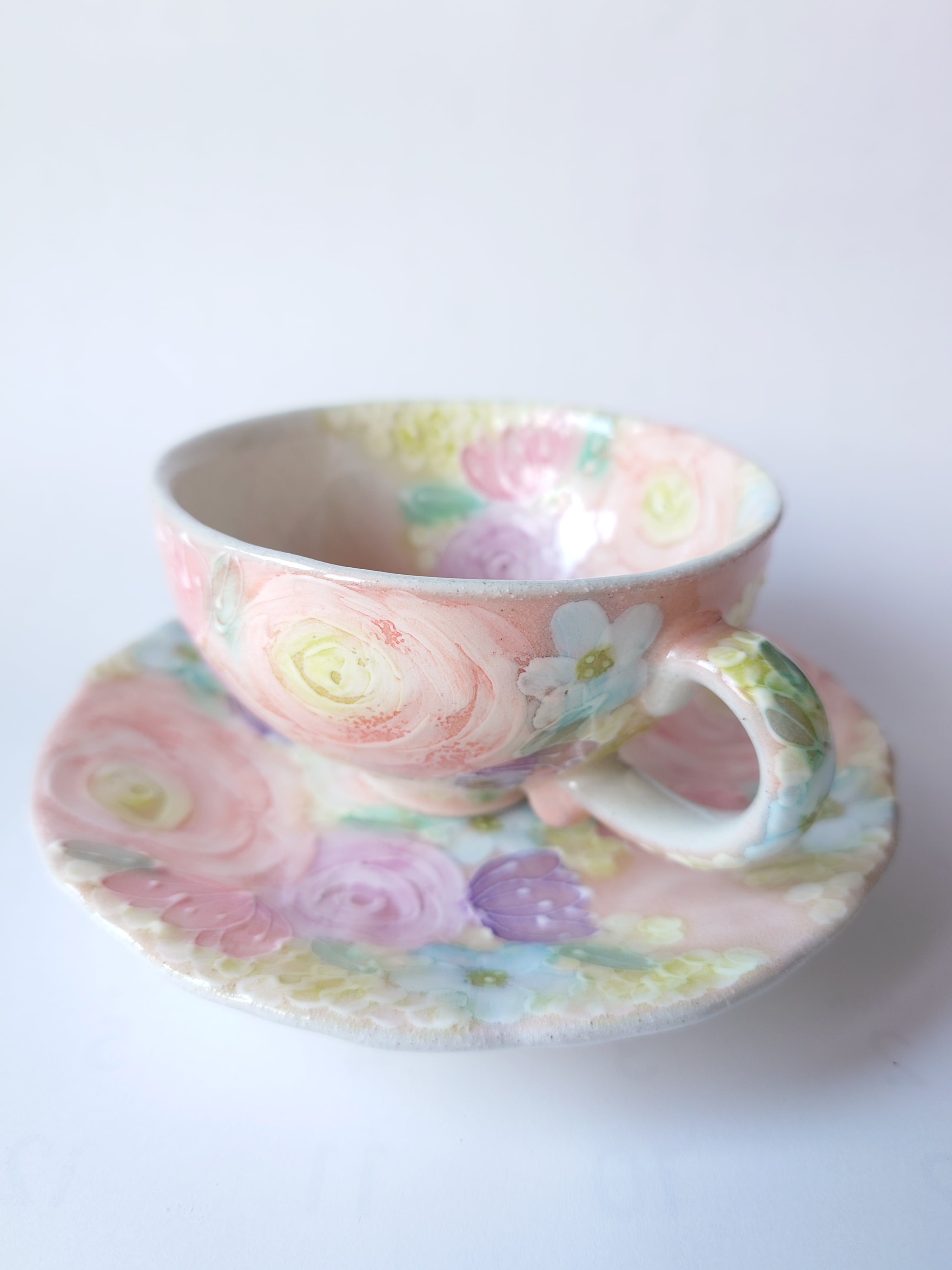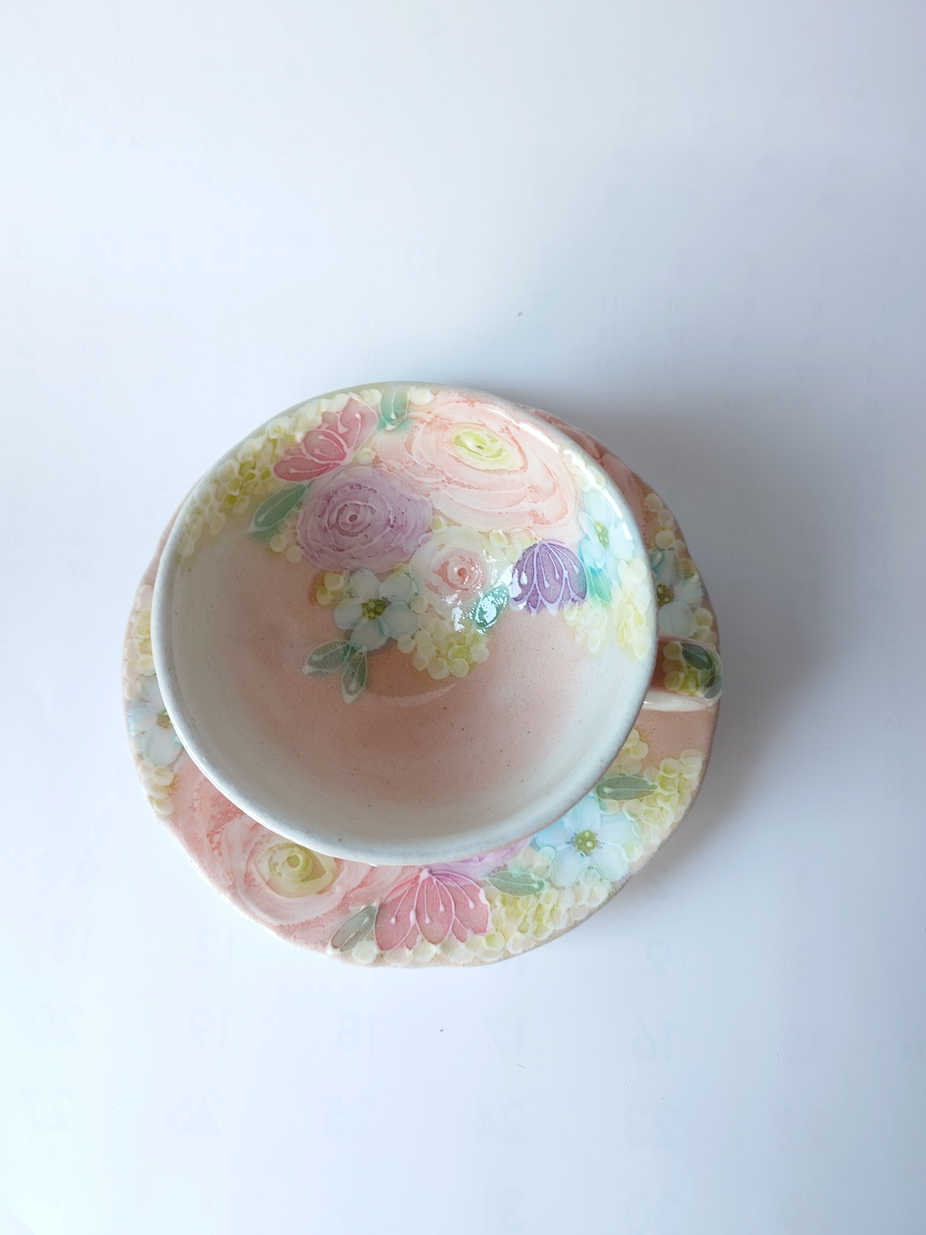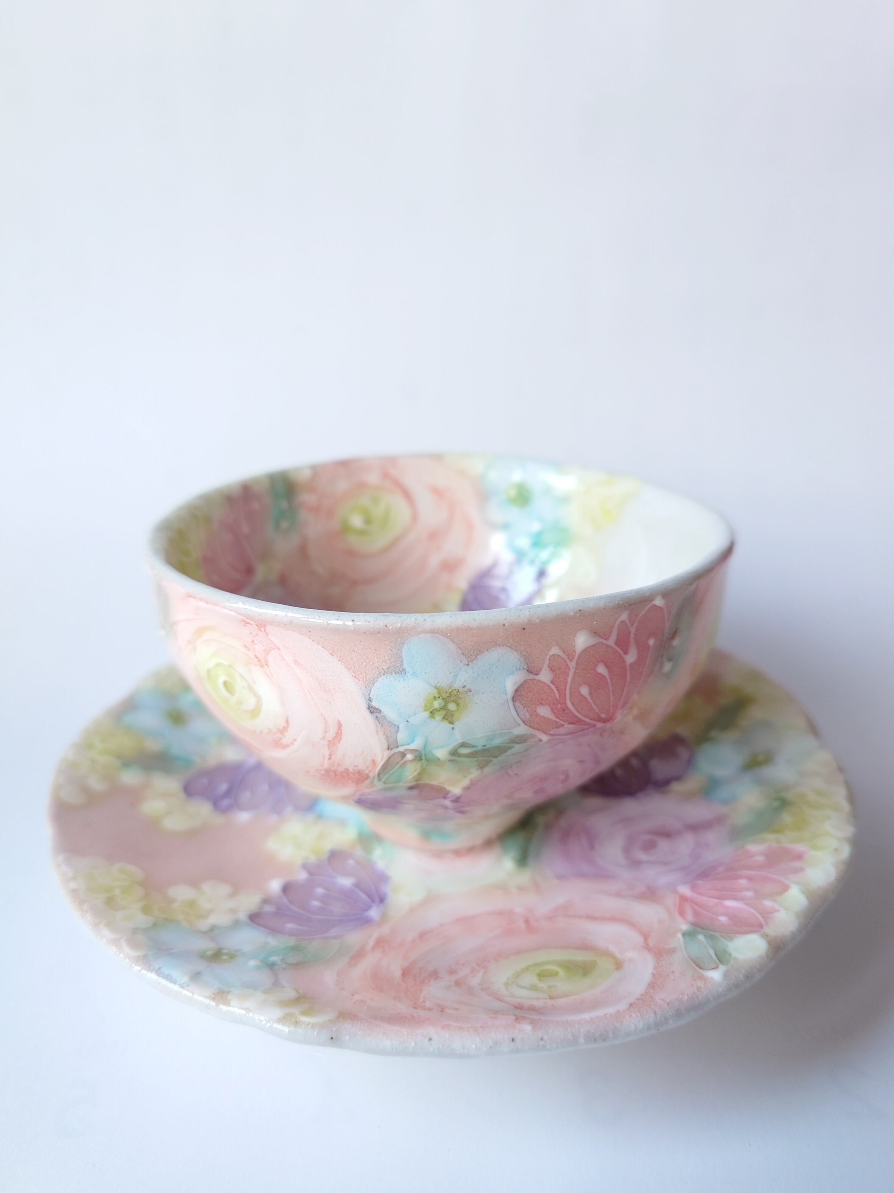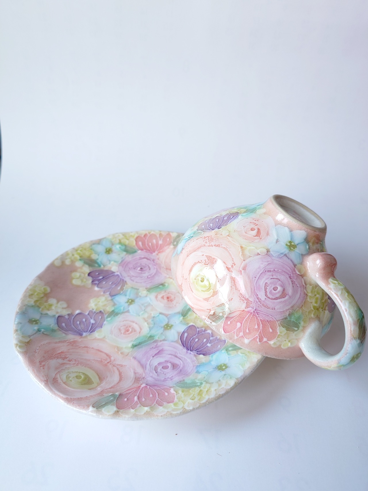 工房ゆずりは カップ&ソーサー ピン系のデフォルメされた薔薇がとても繊細 色彩優花 47037